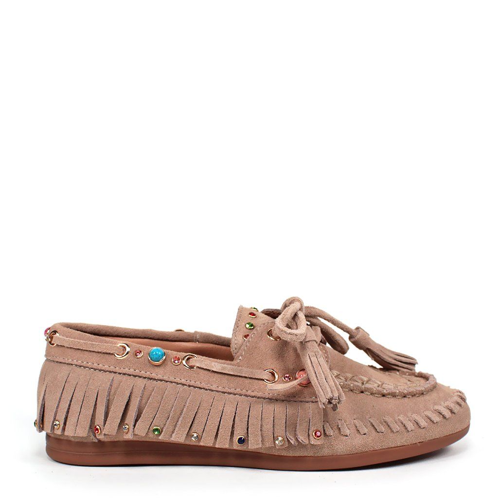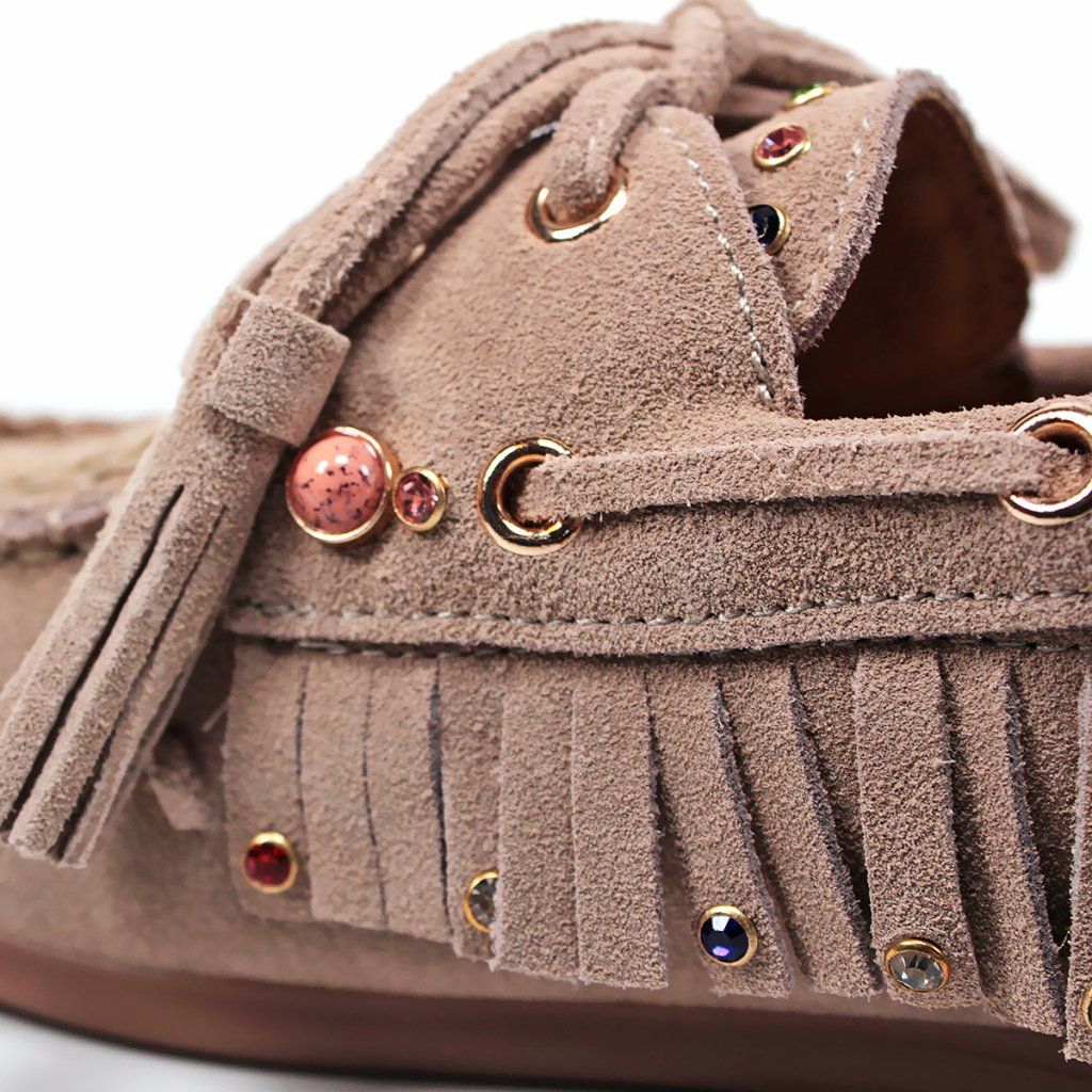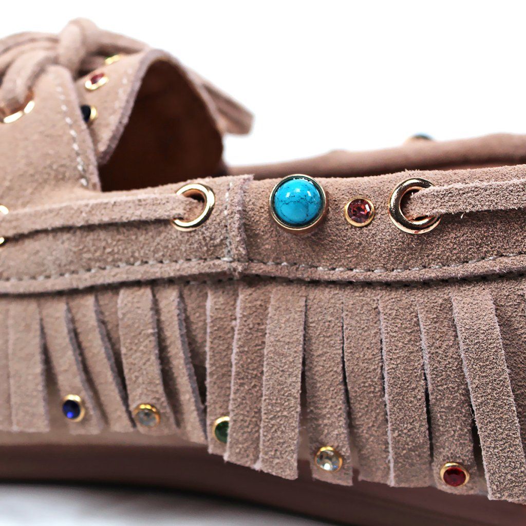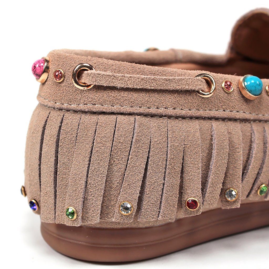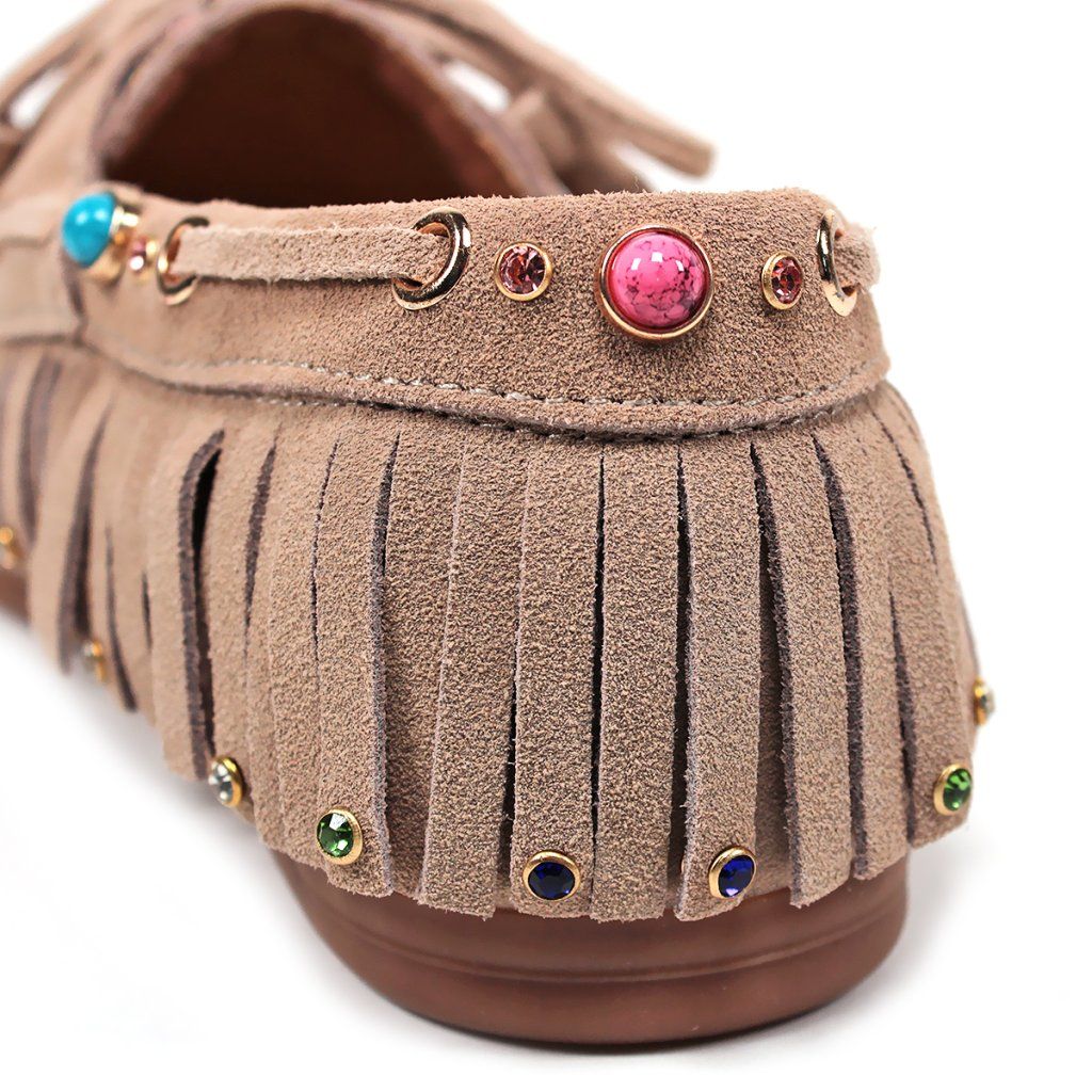 Tegyen ruhájára egy laza csillogást ezekkel az egyedi, boho stílusú félcipőkkel. Valódi velúrbőrből készültek, amely rendkívül puha és kellemes tapintású. A feltűnő rojtok, a finom varrás és a játékos színes kövek teszik ezt a modellt szemet gyönyörködtető darabbá.
