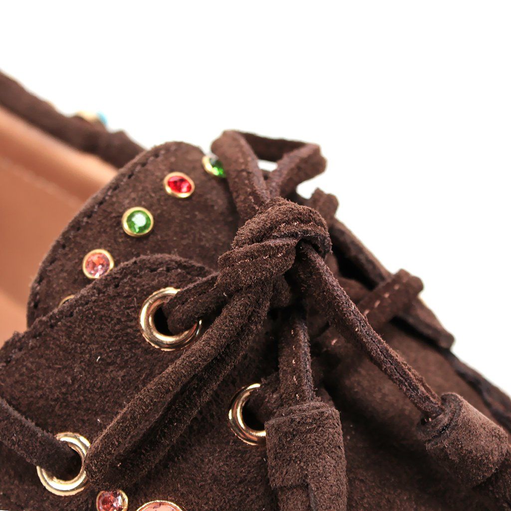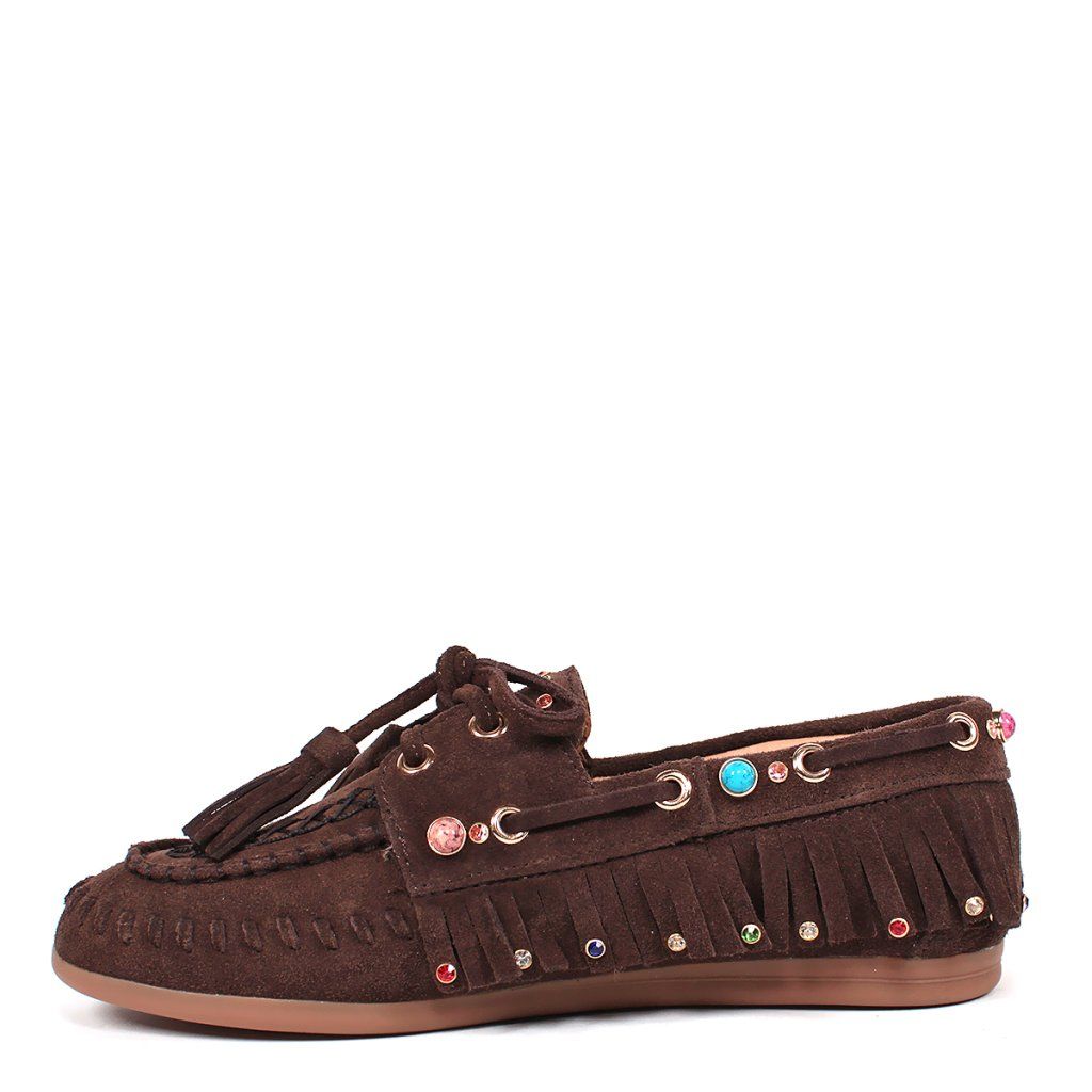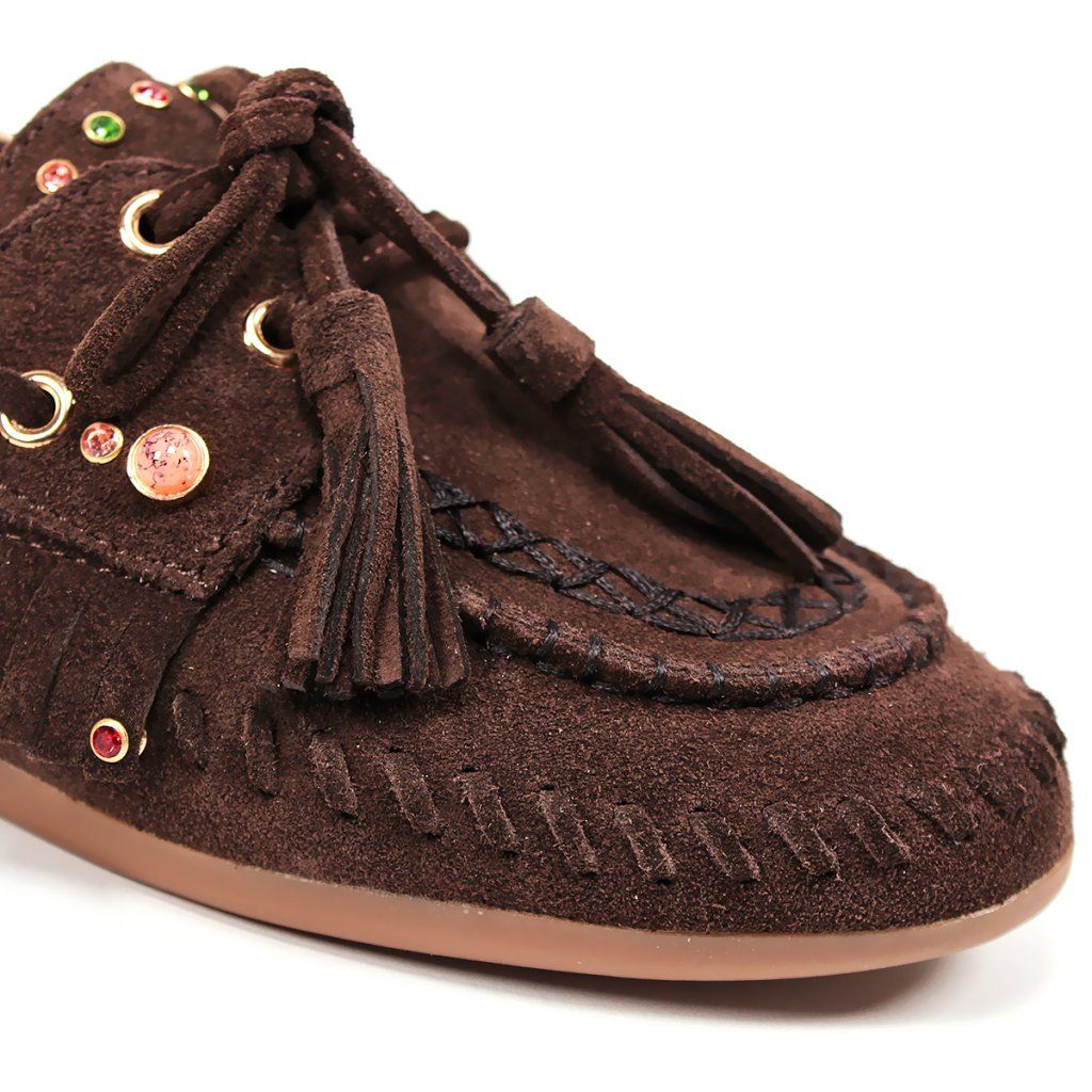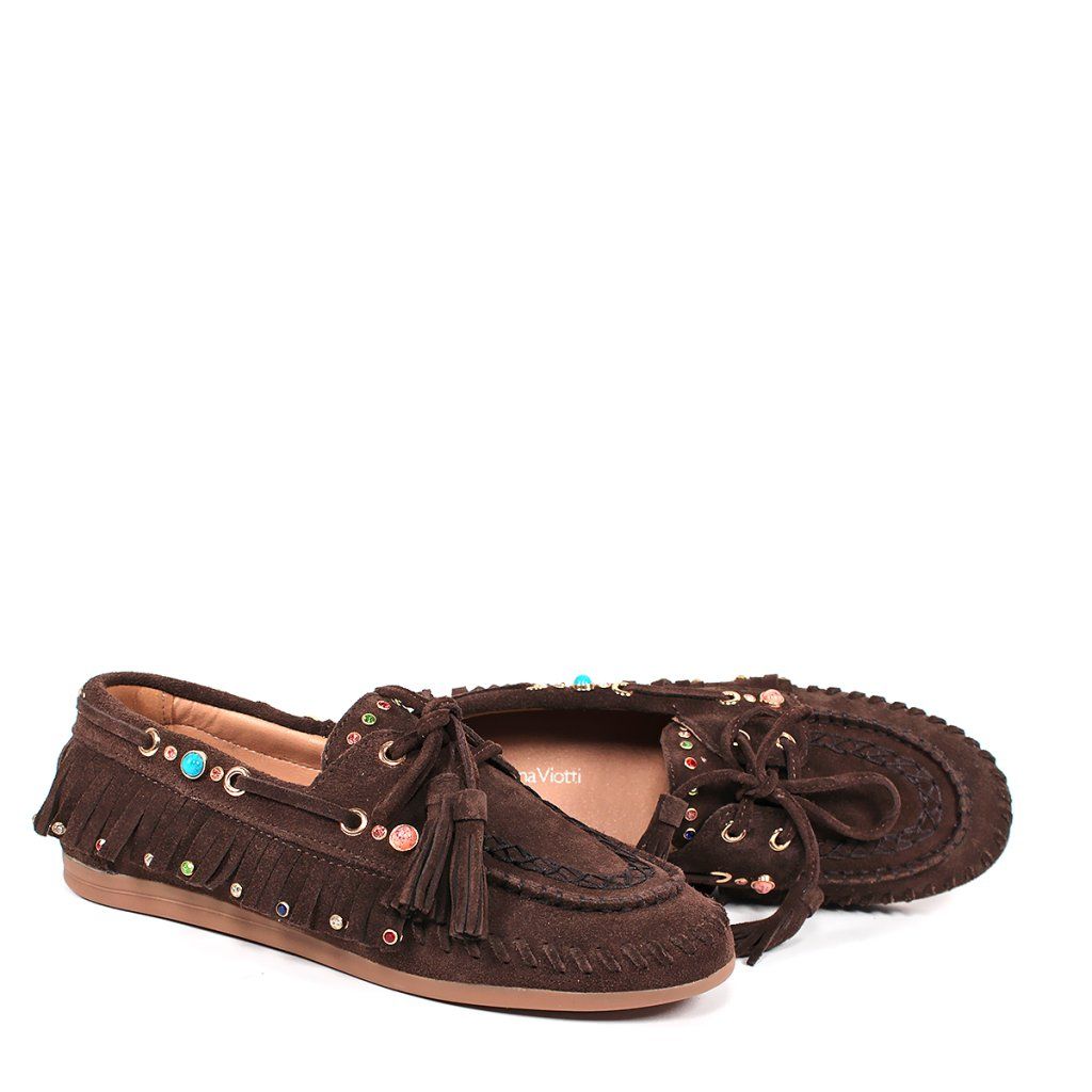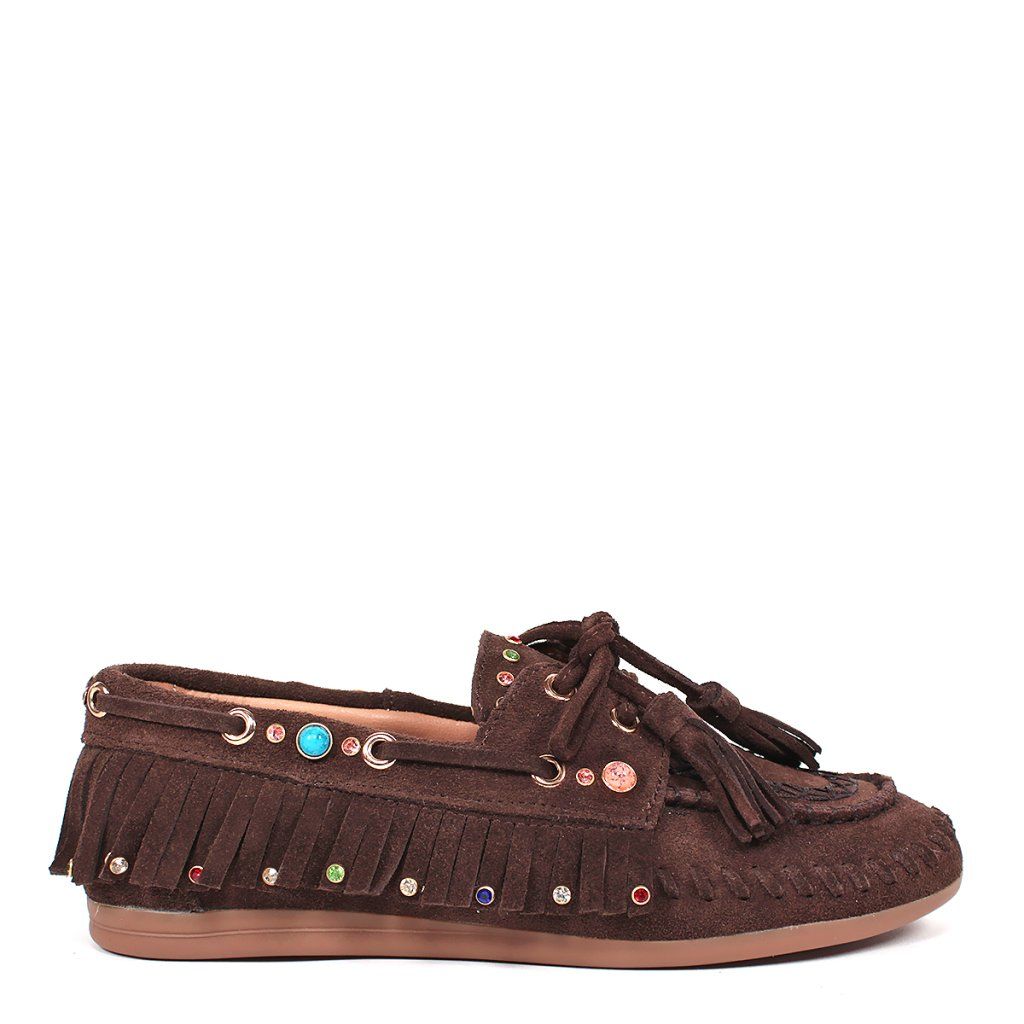 Tegyen ruhájára egy laza csillogást ezekkel az egyedi, boho stílusú félcipőkkel. Valódi velúrbőrből készültek, amely rendkívül puha és kellemes tapintású. A feltűnő rojtok, a finom varrás és a játékos színes kövek teszik ezt a modellt szemet gyönyörködtető darabbá.