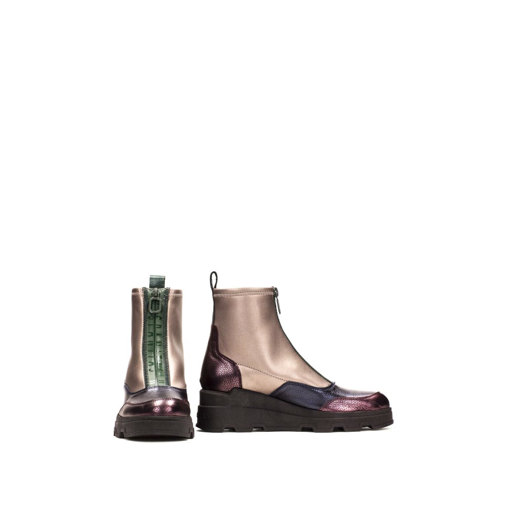Csizma ék alakú sarokkal és kerek orral, lakkbőrből. Márkanévvel ellátott cipzáras záródás a cipő alján. Ez a cipő TRIFLOW technológiával és kivehető talppal is rendelkezik.