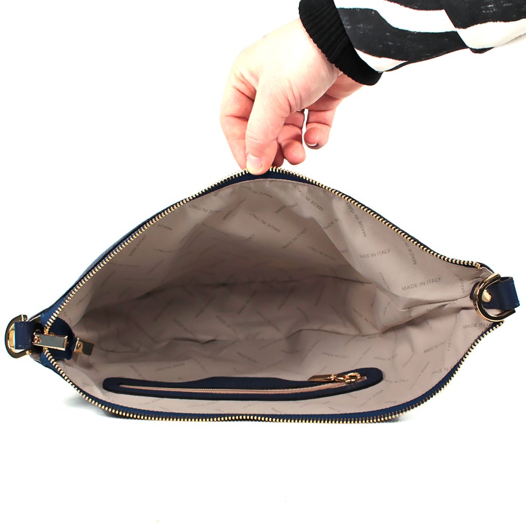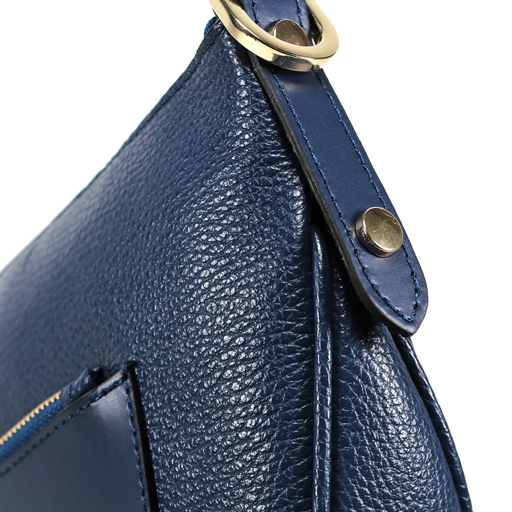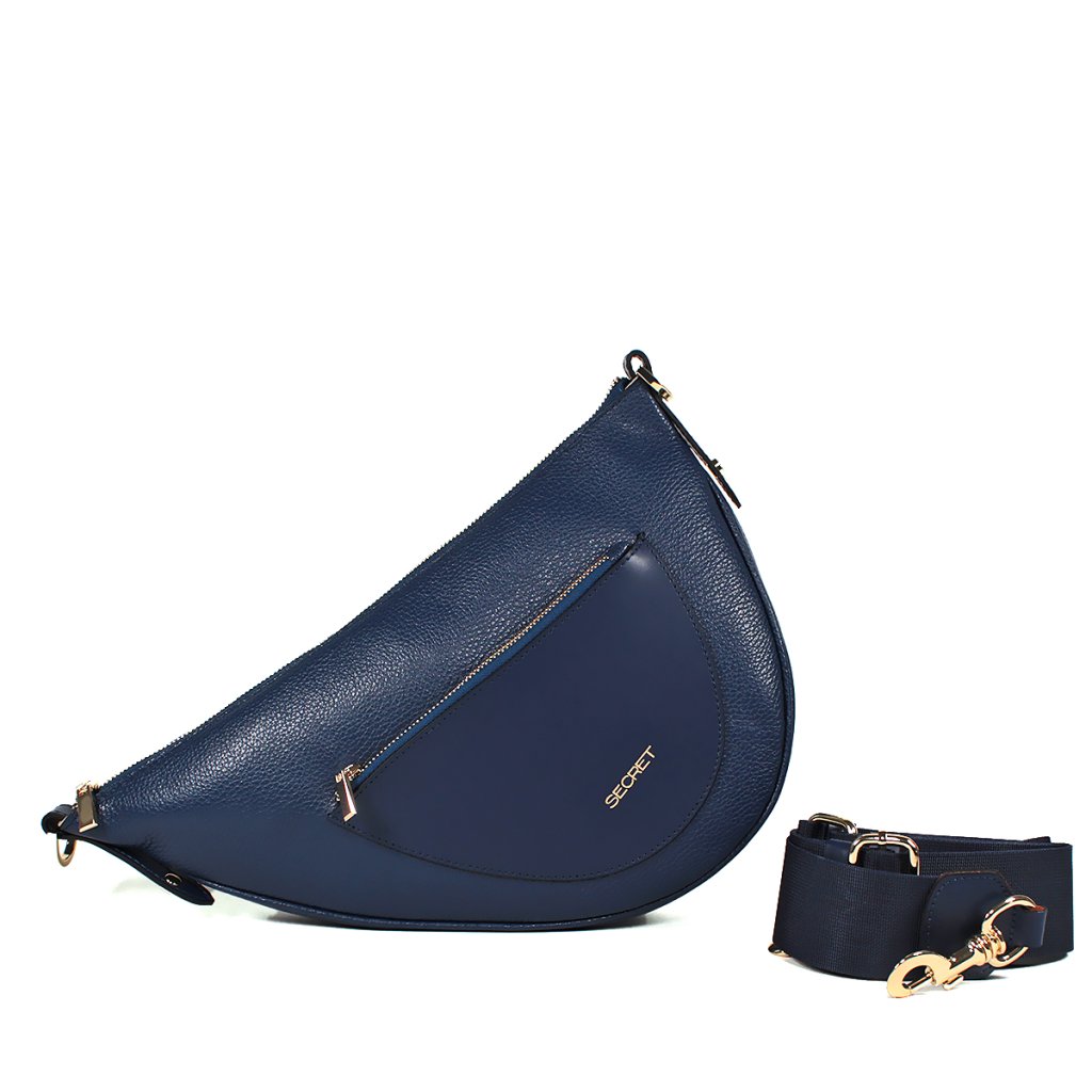 Ez a stílusos és modern sötétkék bőr táska a Titok kollekcióból ideális választás a mindennapi elegancia jegyében. A táska egyedi félhold alakú dizájnjával és prémium texturált bőr felületével tűnik ki, amelyet egy sima elülső zseb és arany fém kiegészítők egészítenek ki, amelyek valódi kifinomultságot kölcsönöznek az egésznek. Tágas belseje elegendő helyet biztosít értéktárgyainak, míg a széles, állítható és levehető pánt kényelmes viseletet garantál a vállon vagy átvetve a testen.