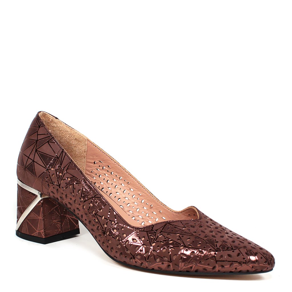 Ez a kivételes, metálos bronz árnyalatú magassarkú tökéletesen ötvözi a modern dizájnt a klasszikus nőiességgel. A cipő teljes felületét egy figyelemfelkeltő geometriai minta díszíti, amely az apró lézerkivágásoknak köszönhetően még légiesebb és egyedibb. A hegyes orr és az aszimmetrikus kivágás elegáns vonalakat kölcsönöz a lábnak, míg a stabil, közepes magasságú tömbsarok egész napos kényelmet biztosít. Az ezüst színű fém részlet a saroknál jellegzetes futurisztikus megjelenést kölcsönöz a cipőnek, így ez a modell ideális választás különleges alkalmakra, vagy a mindennapi viselet stílusos feldobására.