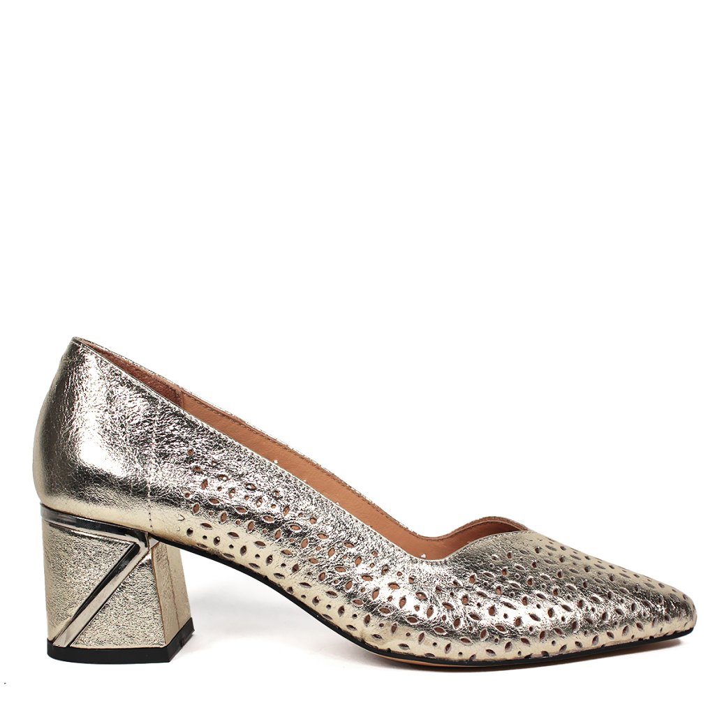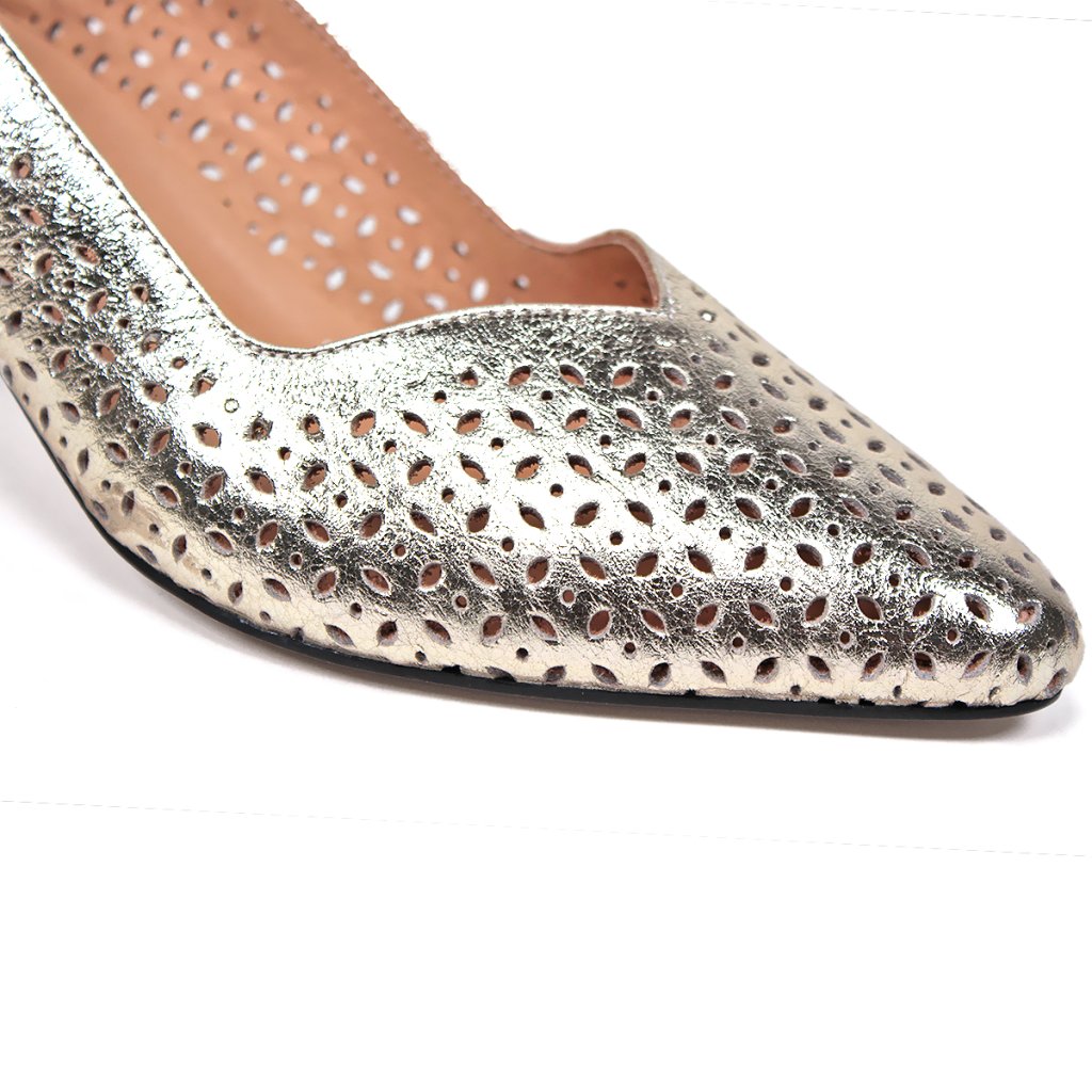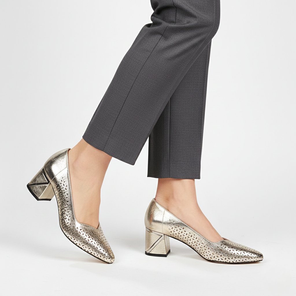 Ez az elegáns arany színű magassarkú tökéletes választás azoknak a hölgyeknek, akik a kifinomult és egyedi stílust kedvelik. A speciális perforált minta nemcsak látványos vizuális elemként hat, hanem kiváló légáteresztést is biztosít. A stabil, közepes magasságú tömb sarok modern fém részlettel van kiegészítve, így kompromisszumok nélküli eleganciával egész napos kényelmet nyújt. A hegyes orr és a finom vonalak nőiessé teszik a megjelenést, legyen szó üzleti találkozóról vagy esti társasági eseményről.