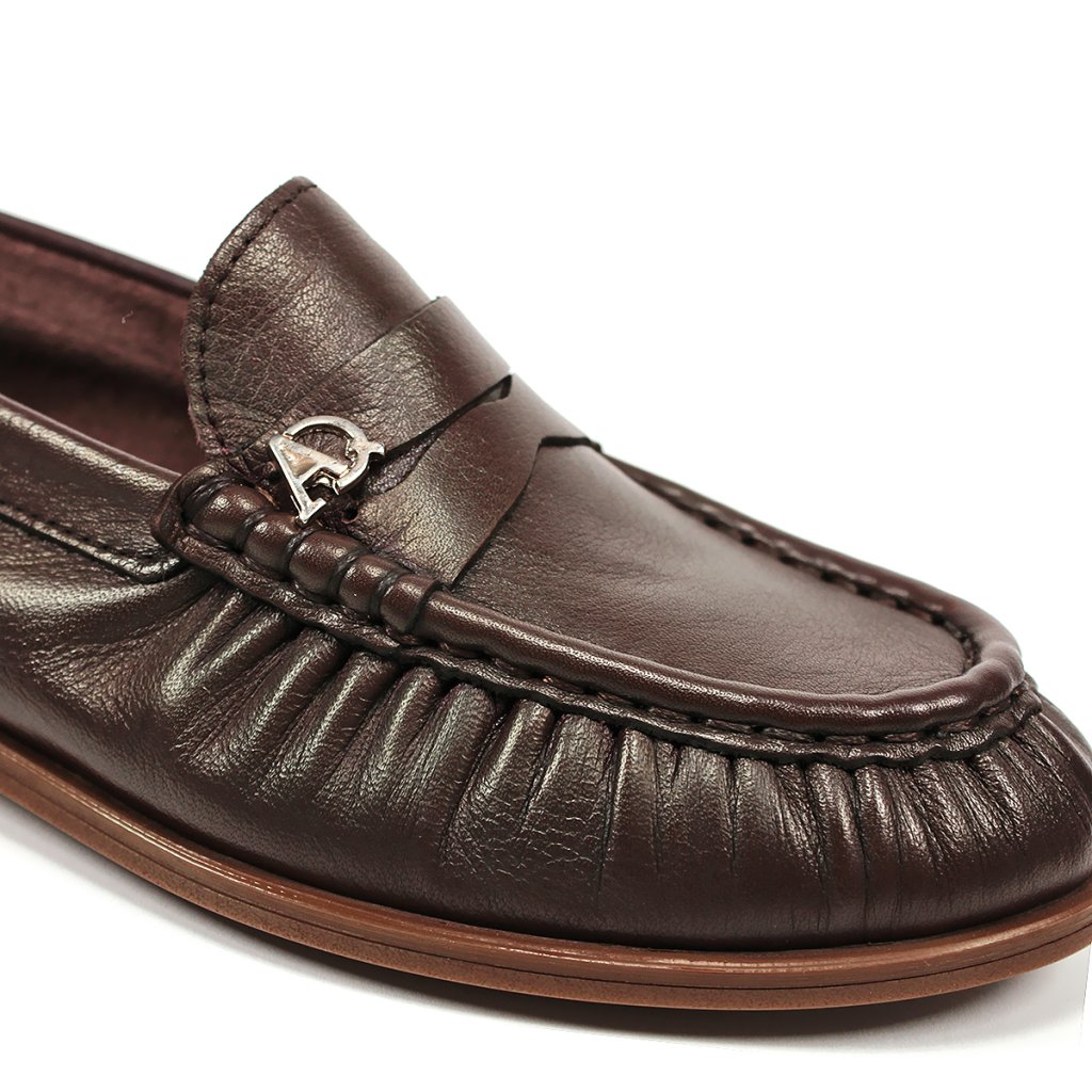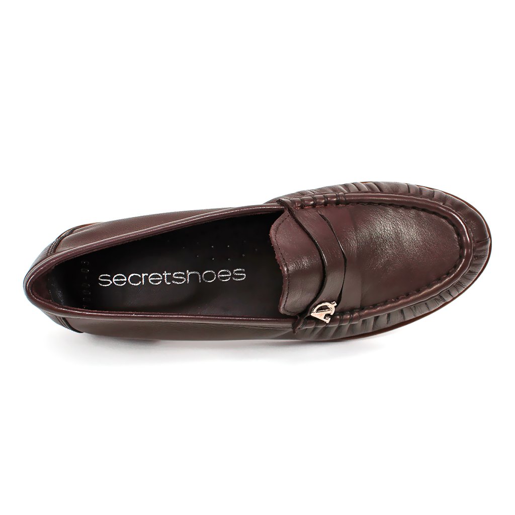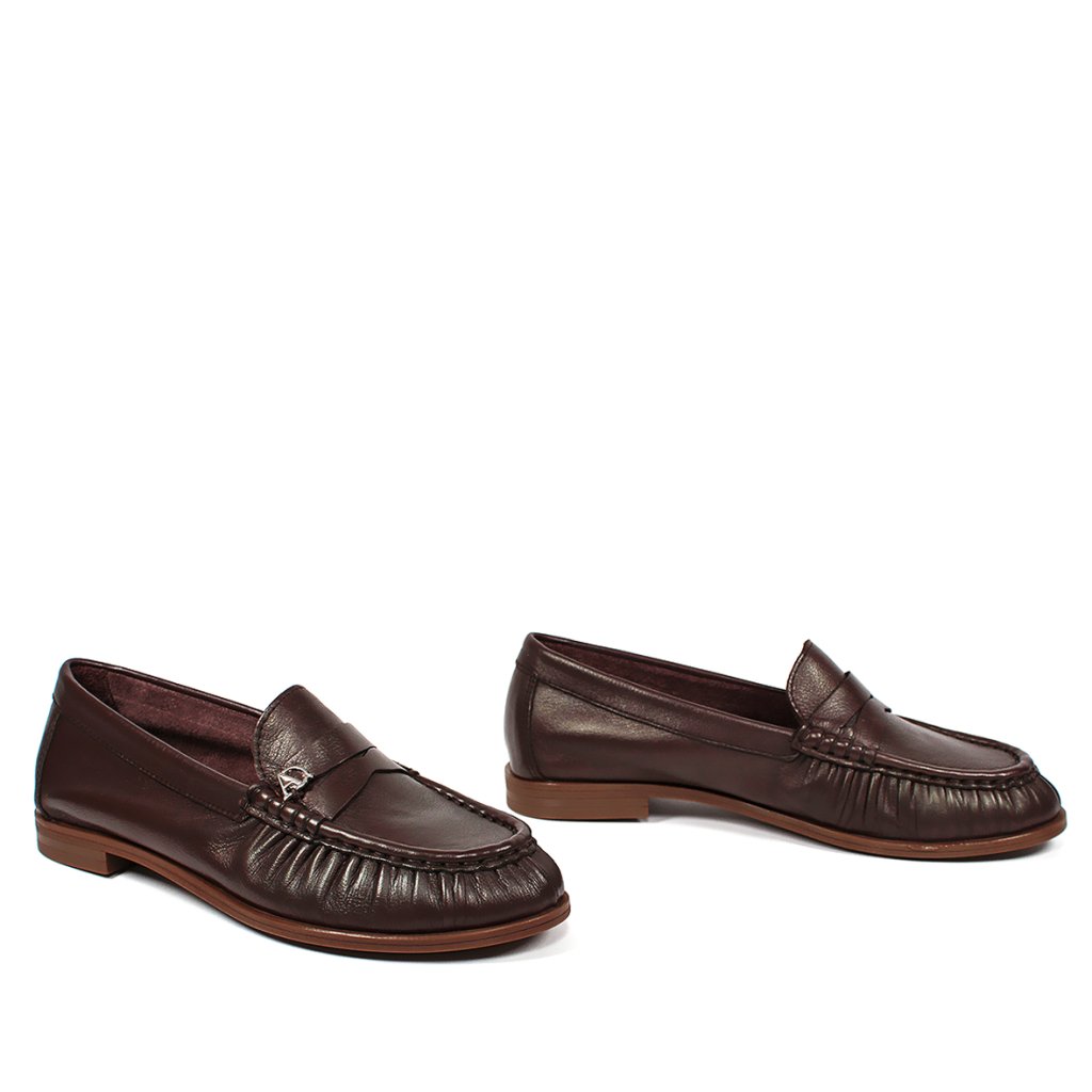 Ez a Secretshoes márkájú női mokaszin sötétbarna árnyalatban a klasszikus elegancia és a mindennapi kényelem tökéletes kombinációja. A prémium puha bőrből készült felsőrész finom ráncolással az elején és precíz varrással tűnik ki, amely egyedi karaktert kölcsönöz a cipőnek. A diszkrét fém márkalogó a rüsztön elegáns fényt kölcsönöz a sötétbarna tónusnak, míg a rugalmas lapos talp stabil és könnyű járást biztosít egész nap. Ideális választás irodába vagy stílusos szettek kiegészítéseként azoknak a hölgyeknek, akik értékelik az időtlen dizájnt és a minőségi anyagokat.