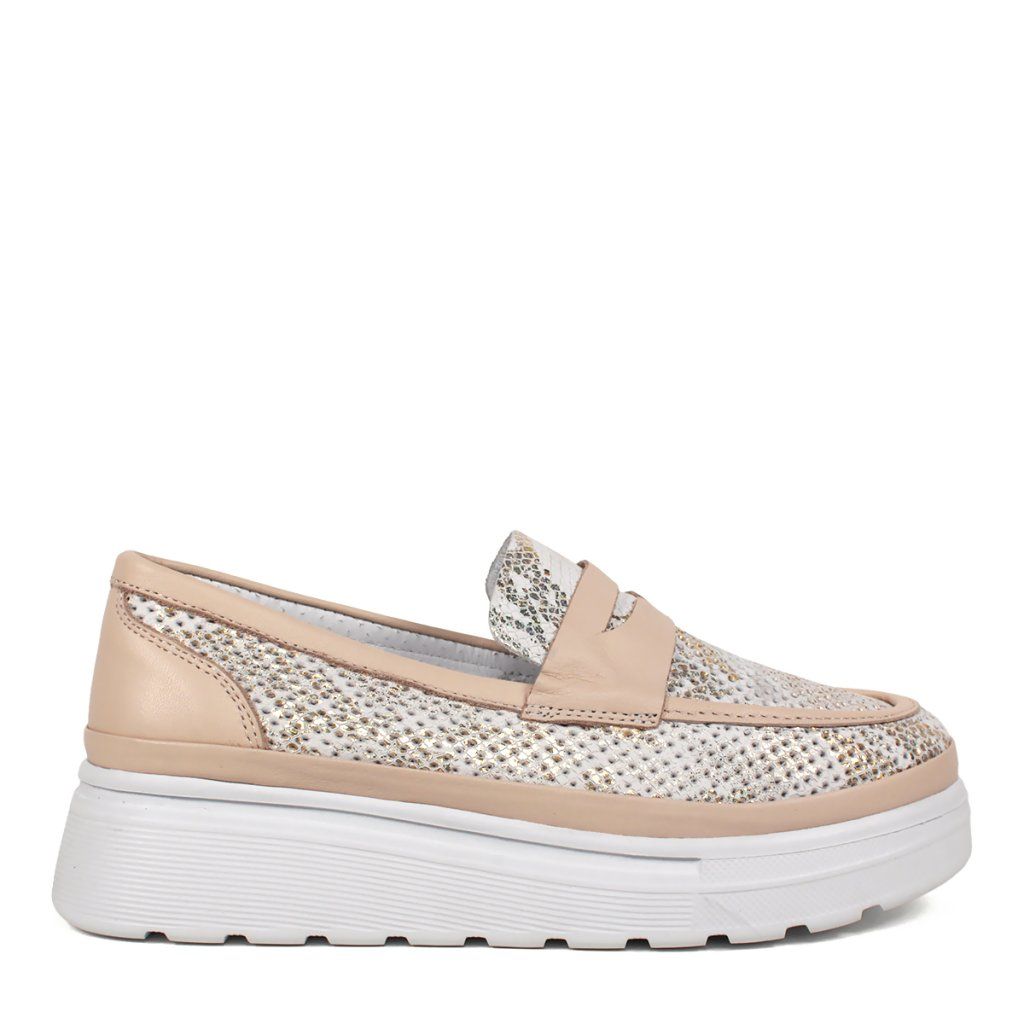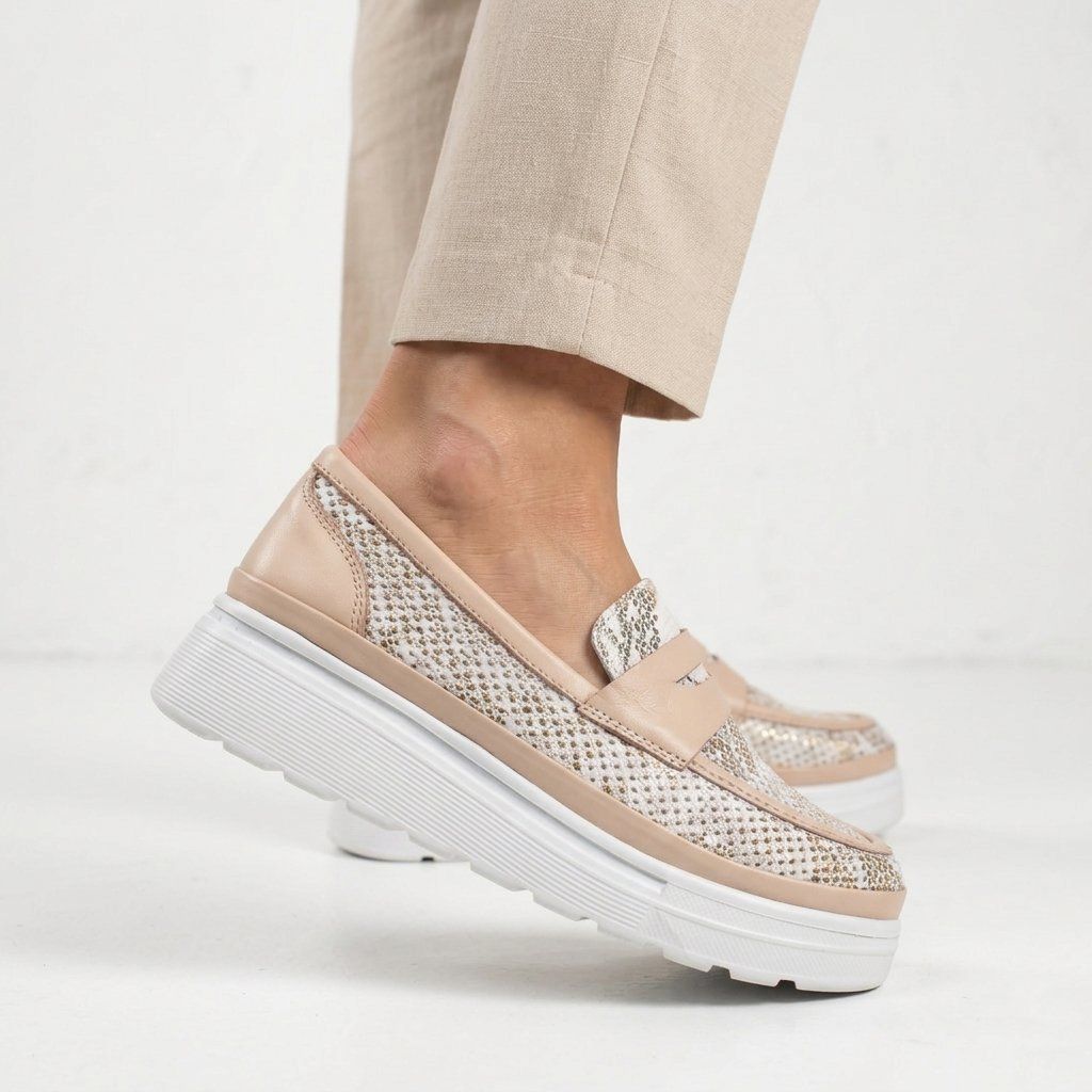 Ez a stílusos női mokaszin a klasszikus szabást a modern sportos kényelemmel ötvözi. A cipő kivételessége a finoman texturált, perforált felsőrészben rejlik, amelyet elegáns, arany és ezüst csillogású kígyómintás részletek díszítenek. A cipő jellegét a pasztell bézs színű bőr szegélyek és a hangsúlyos rátétpánt adják. A vastag, fehér platform talp nemcsak divatos megjelenést biztosít, hanem kiváló párnázást és egész napos kényelmet garantál a lábadnak. Ez a könnyű és légies modell tökéletes kiegészítője a tavaszi és nyári ruhatárnak, legyen szó alkalmi vagy elegánsabb összeállításokról.