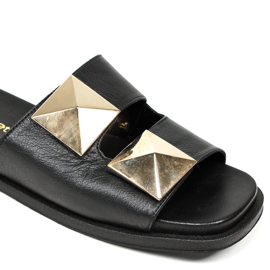 Kényelmes bőr flip-flop kényelmes alacsony talpú, tépőzáras csatokkal, díszítéssel.