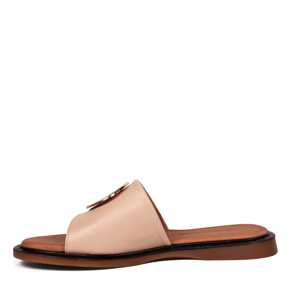 Elegáns és maximálisan kényelmes Secretshoes márkájú bőr papucs. A bézs dizájnt egy feltűnő arany részlet egészíti ki, amely csillogást kölcsönöz a cipőnek. Ideális választás a hétköznapi alkalmi elegancia kedvelőinek.