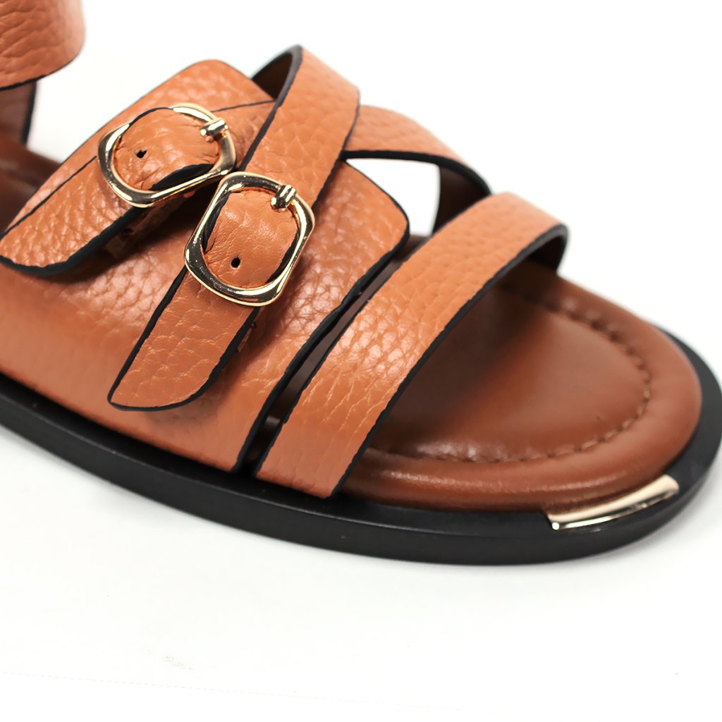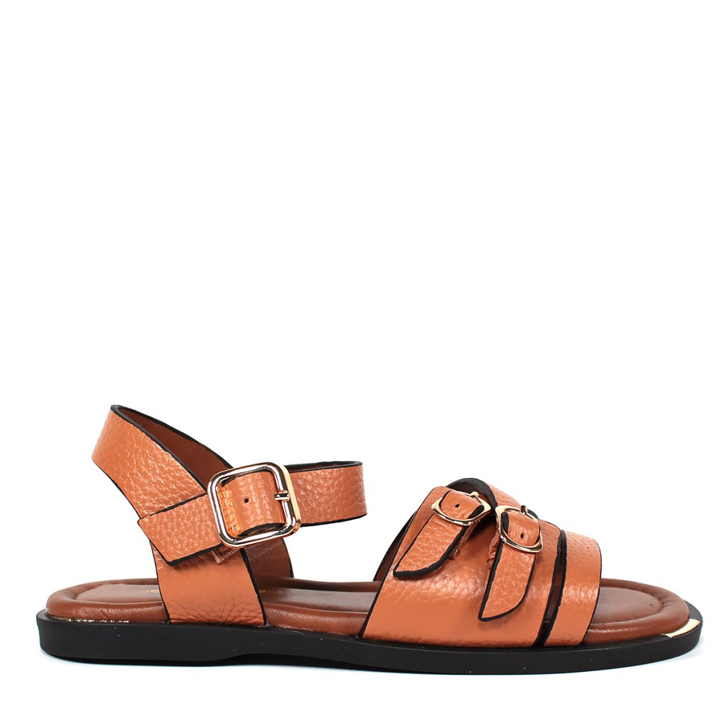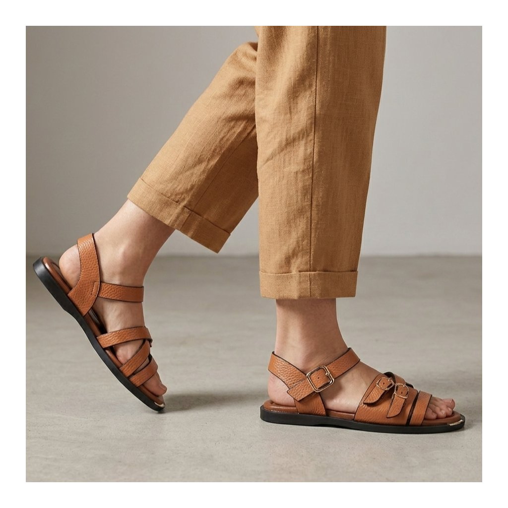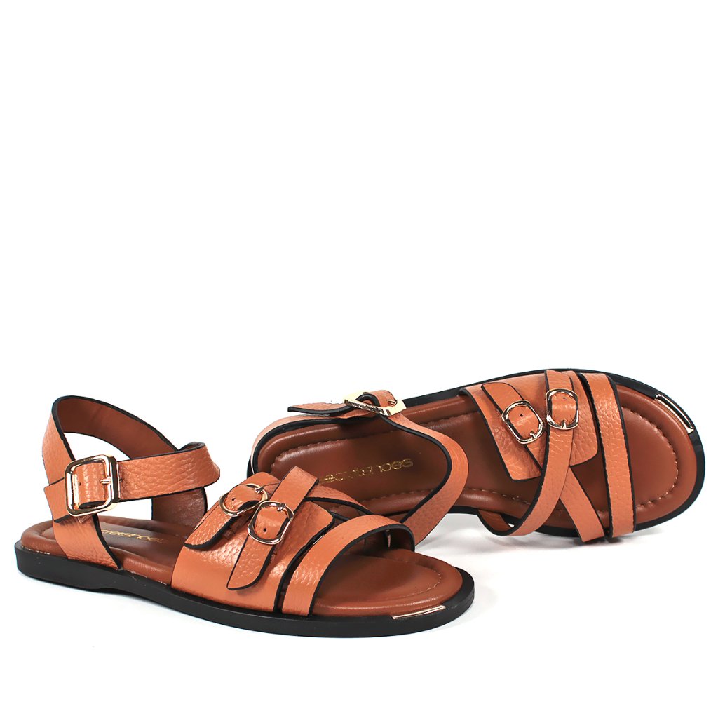Ez a stílusos és kényelmes Secretshoes márkájú női szandál tökéletesen ötvözi a modern eleganciát a praktikummal. A texturált műbőrből készült, meleg barna árnyalatú felsőrészt keresztezett pántok és finom arany csatok díszítik, amelyek nemcsak esztétikusak, hanem stabilan tartják a lábat. A puha, párnázott talpbetét egész napos kényelmet biztosít, míg a vékony fekete gumitalp gondoskodik a tartósságról és a biztonságos tapadásról. Akár könnyű nyári ruhához, akár farmerhez veszi fel őket, ezek a szandálok kifinomult kiegészítői lesznek ruhatárának.