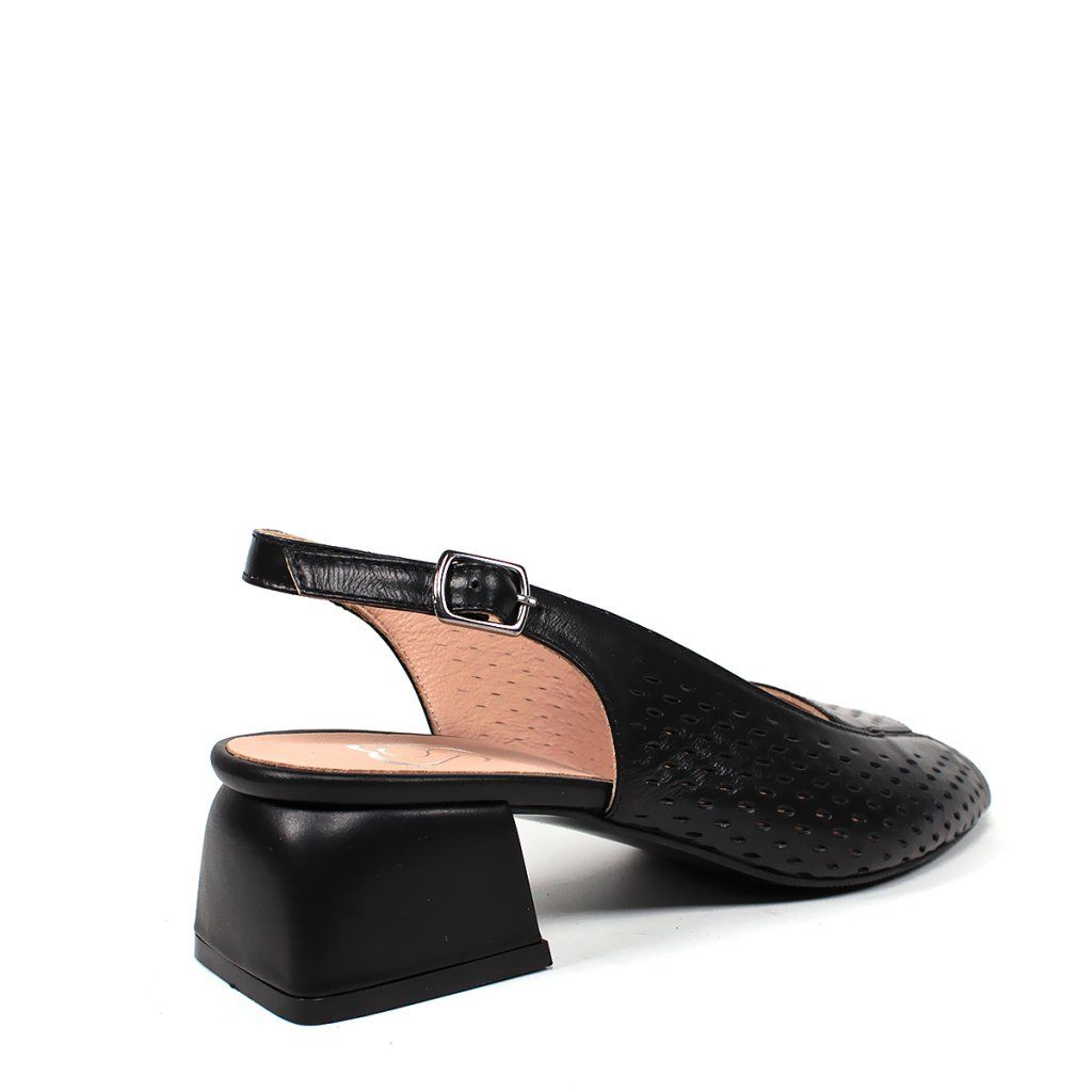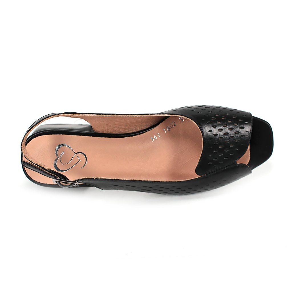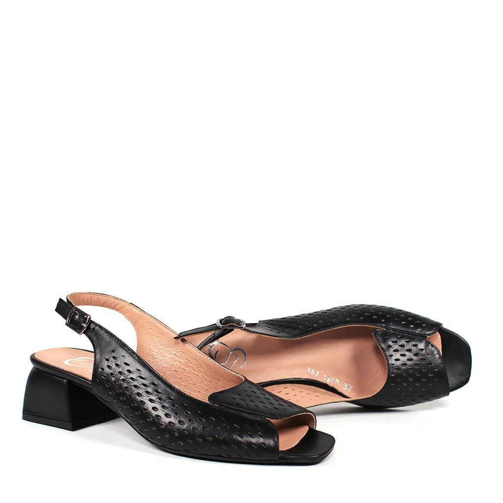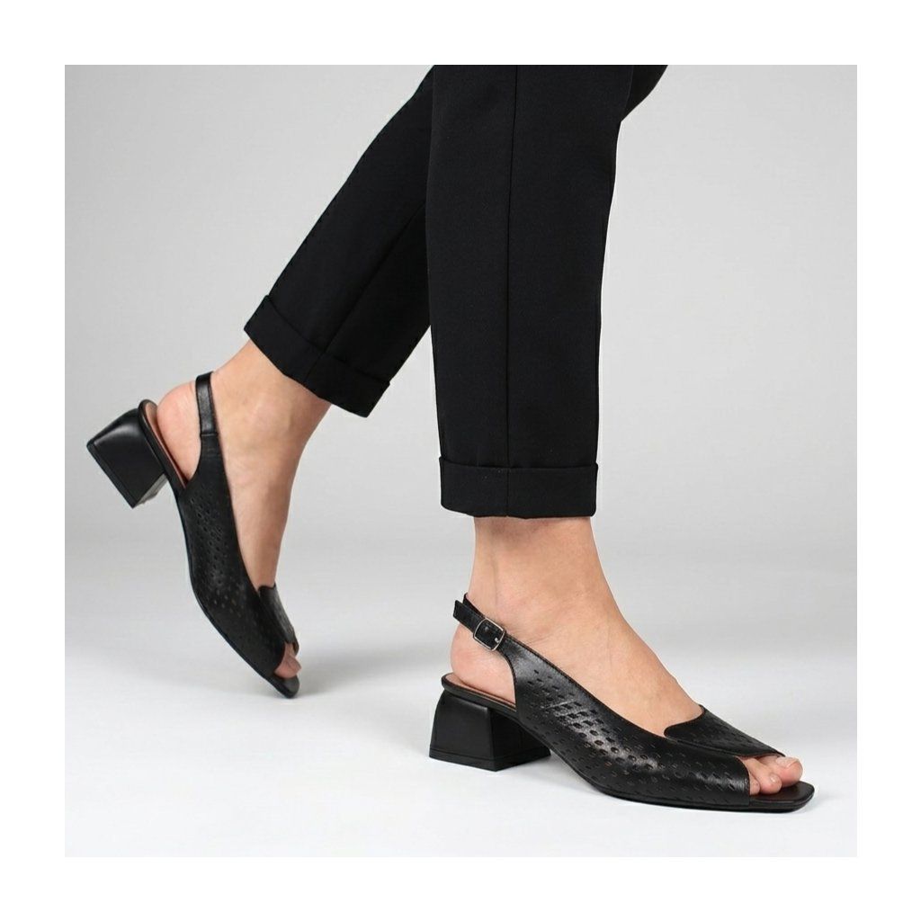 Ez a Secretshoes márkájú, prémium fekete bőrből készült szandál a klasszikus elegancia és a modern kényelem tökéletes kombinációját kínálja. A cipő kivételessége a finoman perforált felsőrészben rejlik, amely nemcsak stílusos megjelenést kölcsönöz a cipőnek, hanem kiváló légáteresztő képességet is biztosít a melegebb napokon. A nyitott orr-rész és a stabil, közepes magasságú tömbsarok gondoskodik a nőies sziluettről anélkül, hogy fel kellene áldoznia magabiztosságát minden lépésnél. A csattal ellátott, állítható sarokpánt precíz illeszkedést tesz lehetővé, a puha belső talp pedig egész napos kényelmet garantál, legyen szó egy munkanapról az irodában vagy egy esti társasági eseményről.