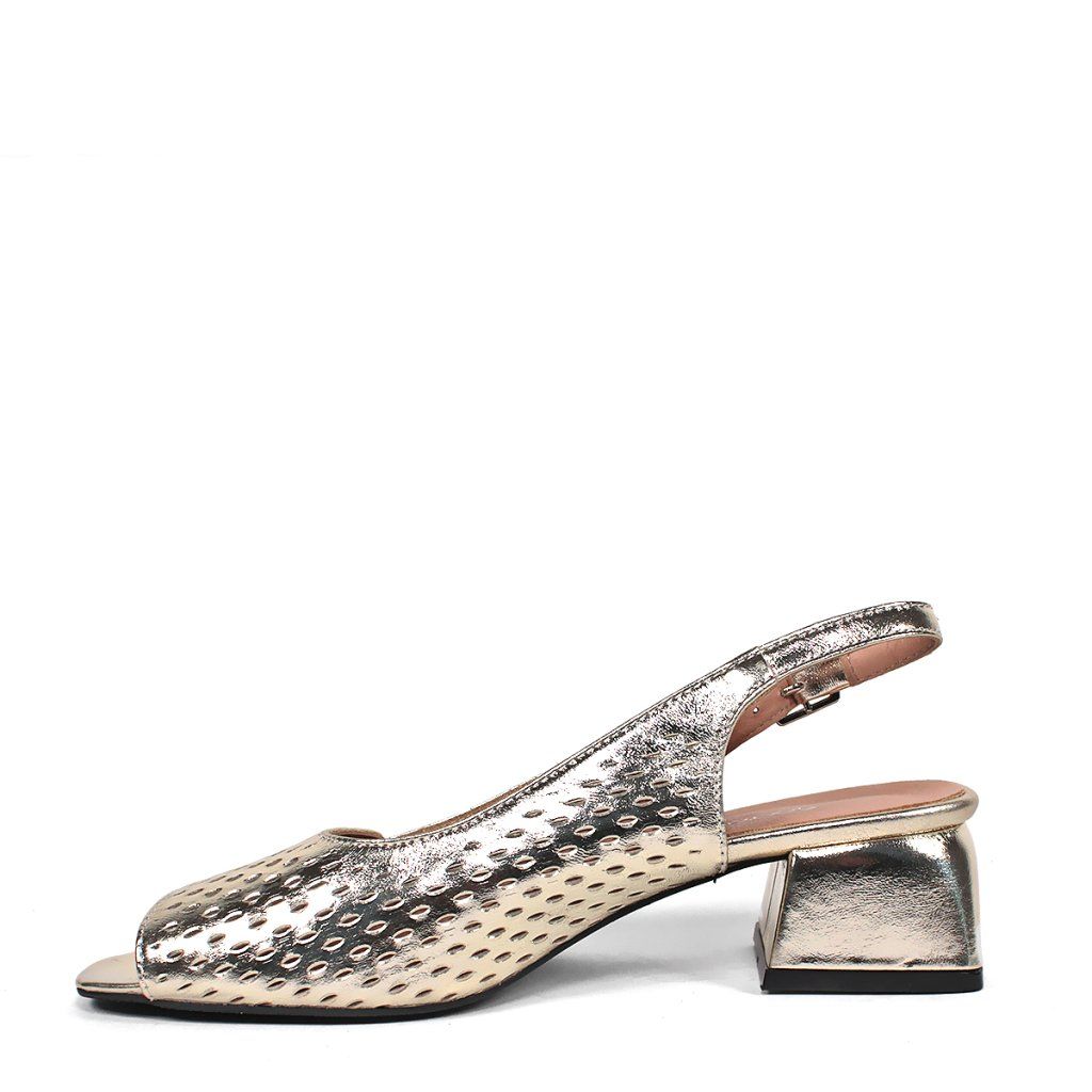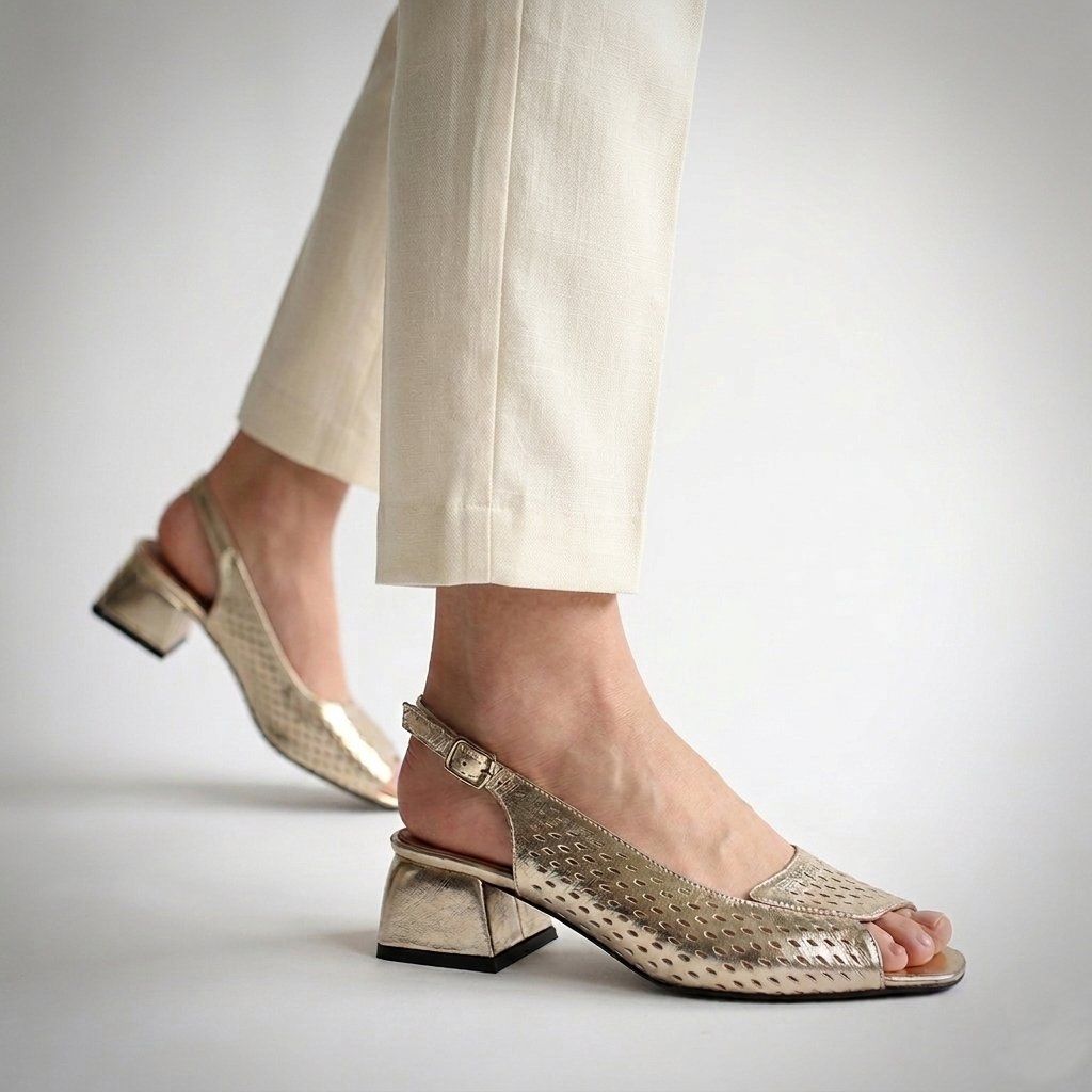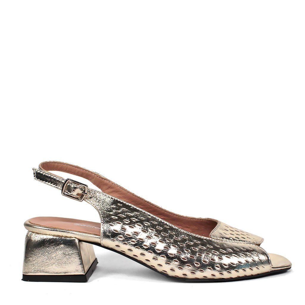 Ez a Secretshoes márkájú arany szandál a modern elegancia és a kényelem stílusos ötvözete, ideális a nyári szezonra. Ez a lábbeli egyediségét a finom perforált minta adja, amely légies és nőies megjelenést kölcsönöz, miközben biztosítja a lábak szellőzését a meleg napokon. Az elegáns, nyitott orrú dizájn és az állítható bokapánt tökéletes illeszkedést kínál, míg a stabil, széles tömbsarok kompromisszumok nélküli, egész napos kényelmet garantál. Fényes felületének és letisztult vonalainak köszönhetően kiválóan illik alkalmi ruhákhoz és farmeres, laza szettekhez egyaránt.