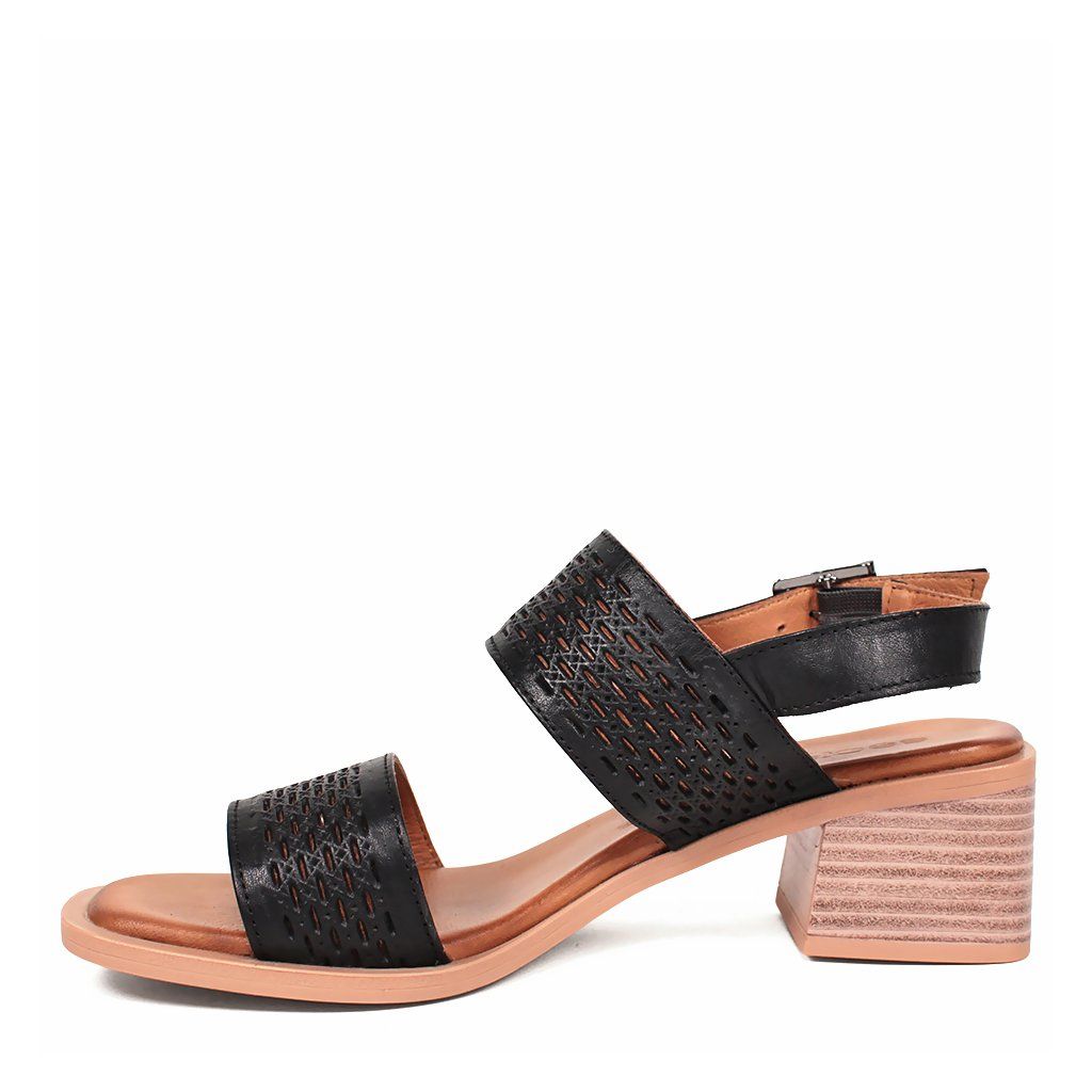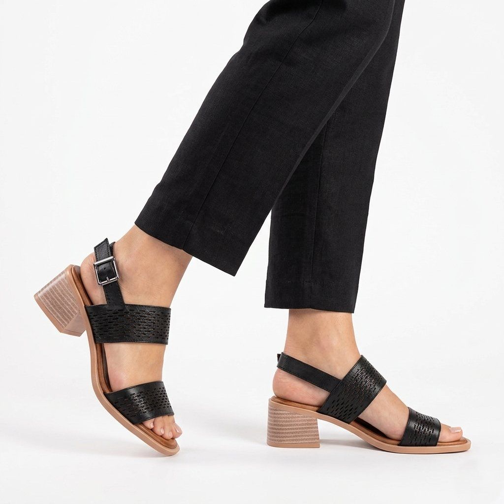 Ez a fekete bőr szandál tökéletes ötvözete a stílusnak és a kényelemnek, így ideális választás mindennapi viseletre, mind különleges alkalmakra. A cipő egyediségét a lézerrel vágott perforált pántok adják, amelyek nemcsak esztétikusak, hanem kiváló szellőzést is biztosítanak a lábnak. A stabil, közepes magasságú tömbsarok természetes fa hatású textúrával rendelkezik, amely modern kontrasztot alkot a sötét felsőrésszel. Az elegáns csat segítségével a saroknál a szandál pontosan a lábfejhez igazítható, míg a párnázott belső talp egész napos kényelemérzetet garantál.