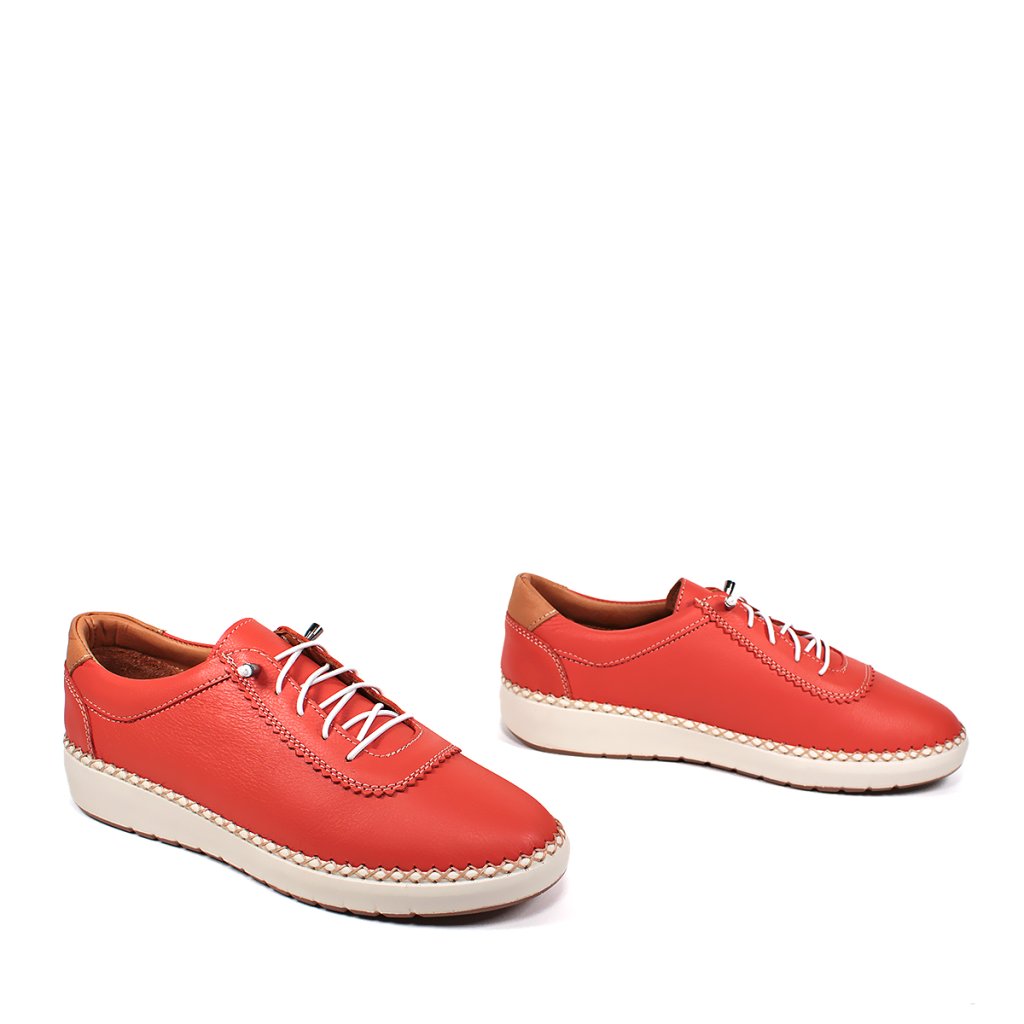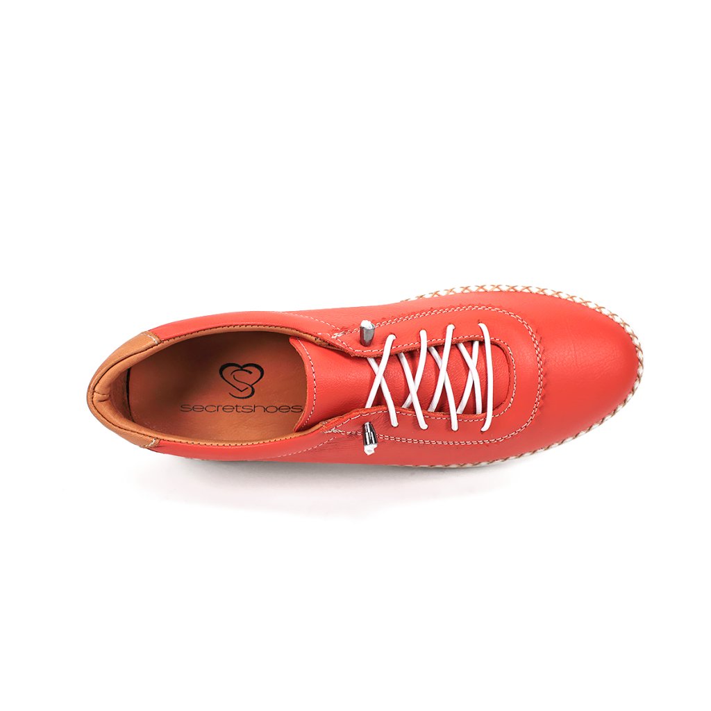 Ezek a világos narancssárga női bőr cipők, a Secretshoes márkától, tökéletes kombinációt kínálnak a mindennapi stílus és kényelem terén. A felsőrész prémium minőségű, puha bőrből készült, és egyedi kézi varrással, kötött hatással a talp mentén díszített, ami nem csak tartósságot, hanem kivételes karaktert is kölcsönöz a cipőnek. A kontrasztos fehér fűzők és a rugalmas, megemelt fehér talp modern sportos megjelenést biztosítanak, míg a sarok barna díszítése finom eleganciát visz az összképbe. A cipő belső kialakítása a márkajelzéssel ellátott talpbetéttel együtt egész napos kényelmet garantál, így ideális választás városi sétákhoz vagy mozgalmas munkanapokhoz.