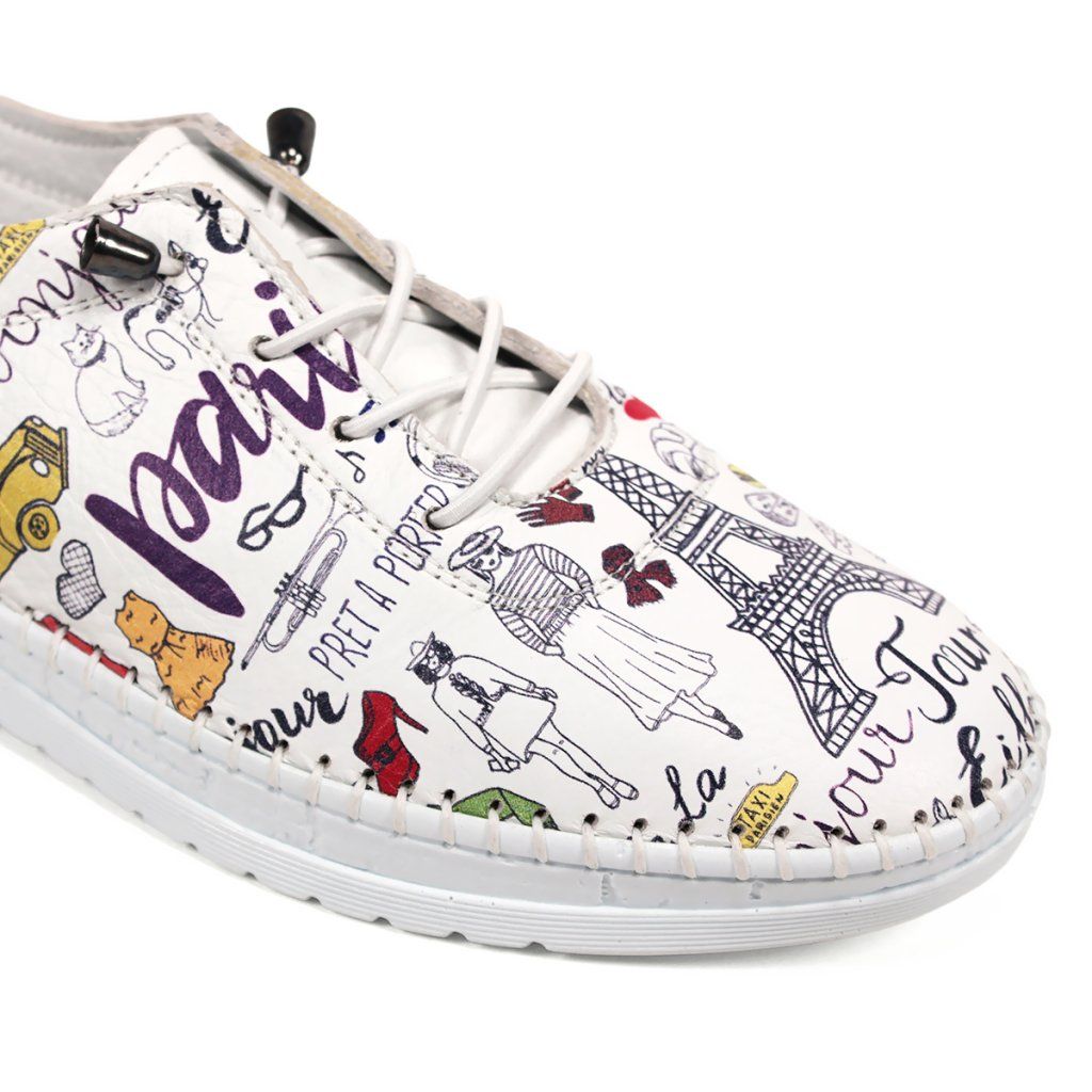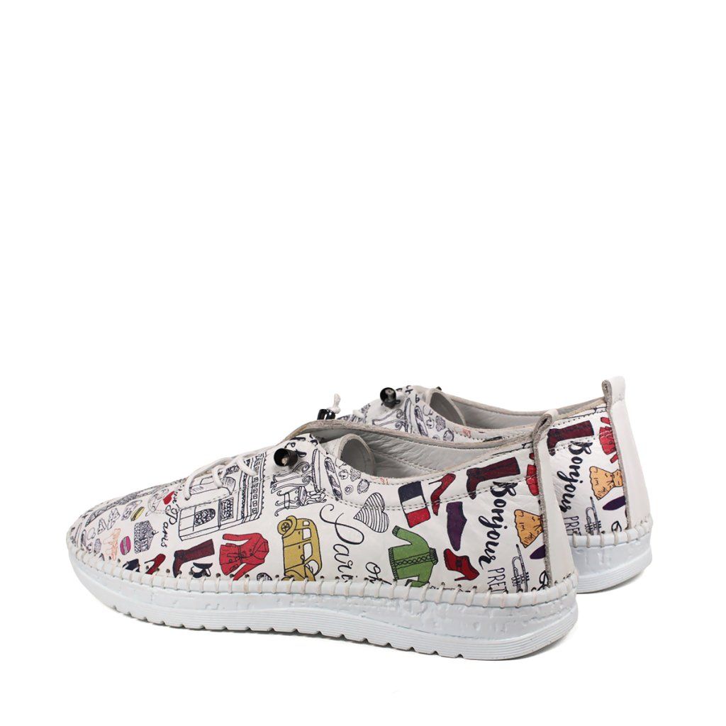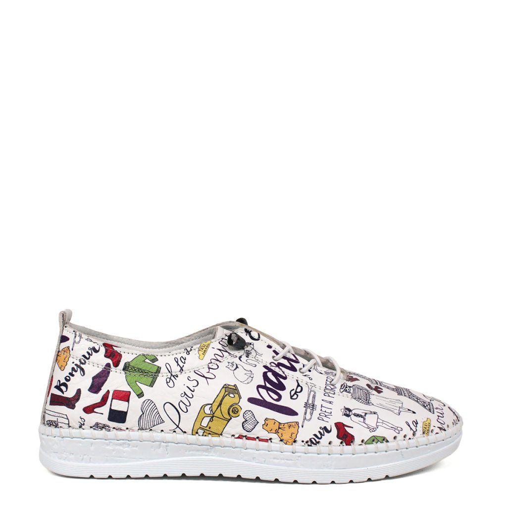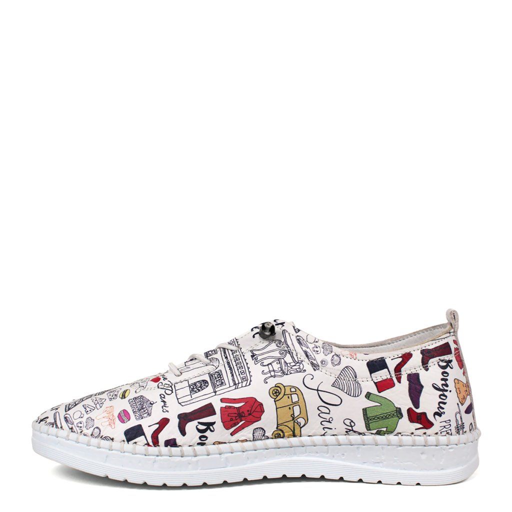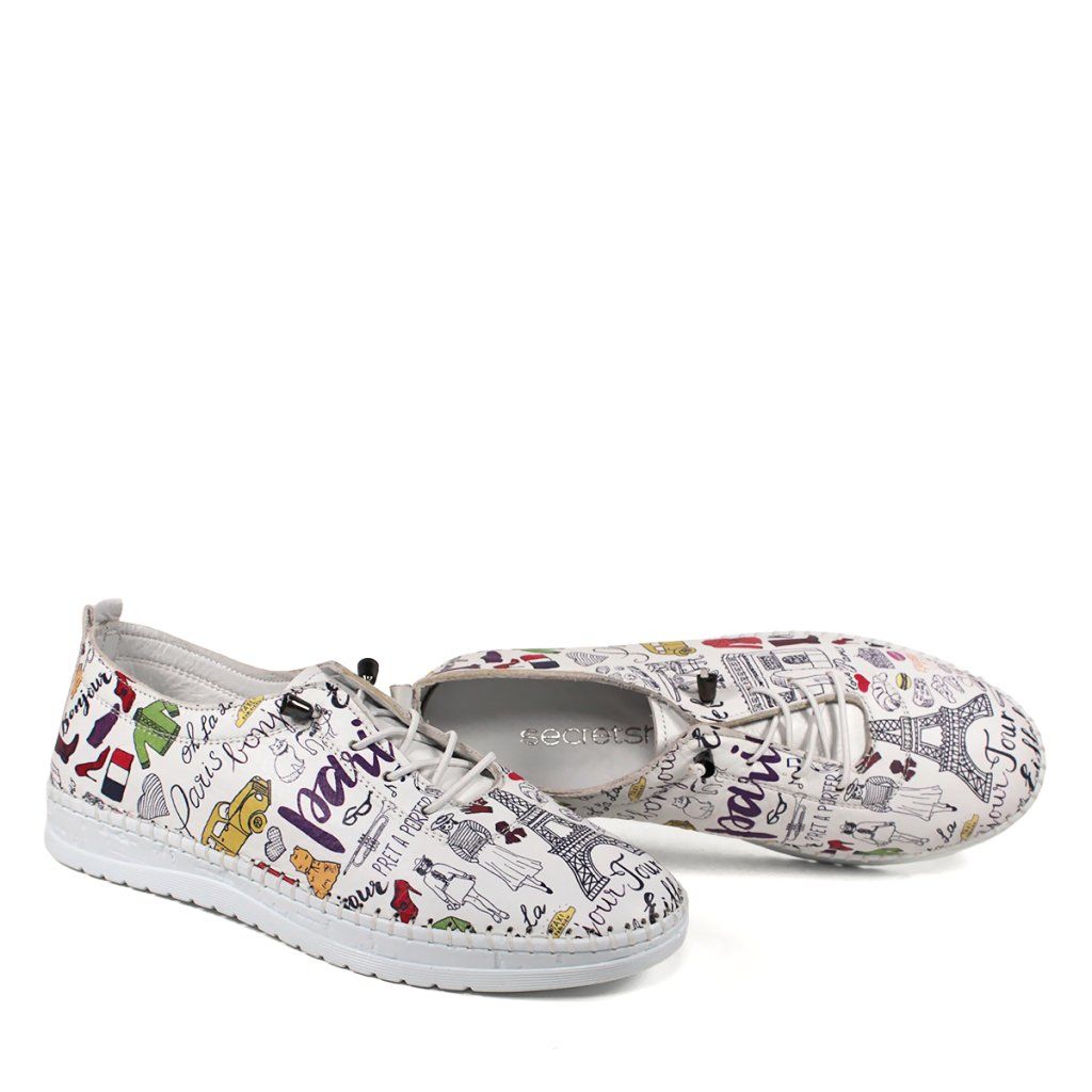 Ez a fehér női félcipő valódi bőrből készült, tökéletes ötvözete a játékos eleganciának és a kényelemnek. A cipő teljes felületét Párizs ihlette bohém grafikák díszítik, beleértve az Eiffel-tornyot, divatkiegészítőket és stílusos feliratokat, amelyek egyedi és művészi megjelenést kölcsönöznek a viselőjének. A speciális, fémvégű elasztikus fűzőrendszer nemcsak modern dizájnt biztosít, hanem gyors és egyszerű felvételt is lehetővé tesz. A puha, steppelt fehér talp egész napos kényelmet garantál, így ez a modell ideális választás városi sétákhoz vagy mindennapi stílusos viselethez.