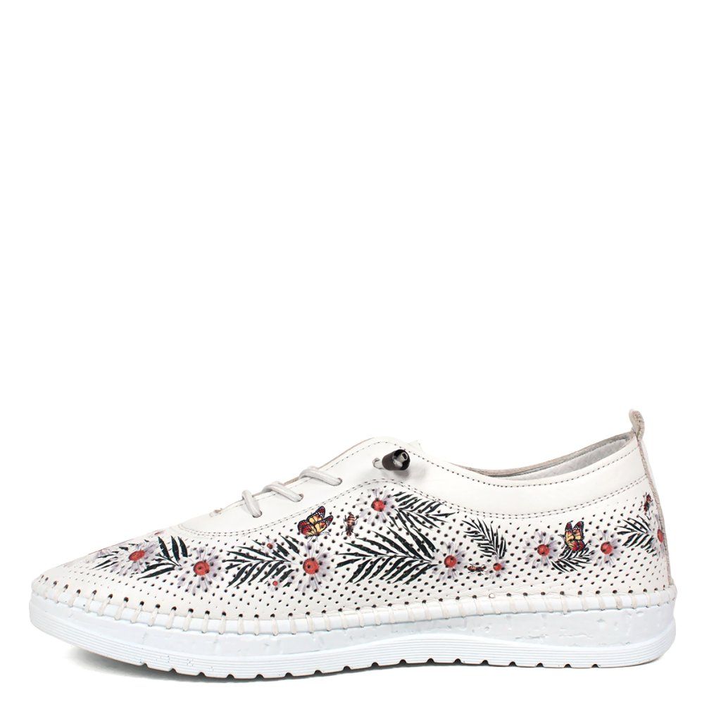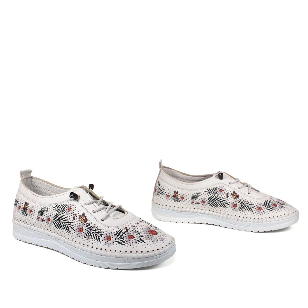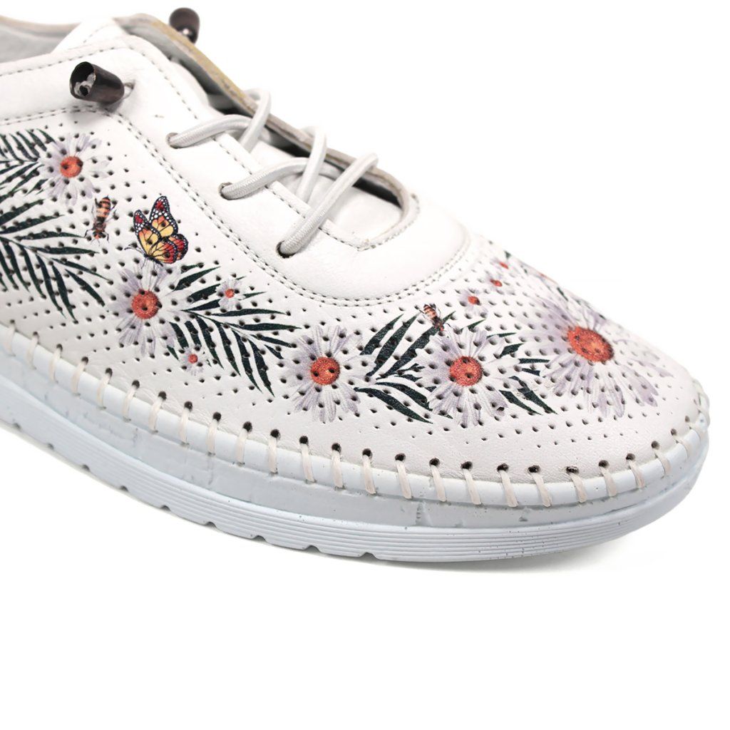 Ez a bájos fehér női bőr cipő igazi ékessége a tavaszi és nyári ruhatárnak. A cipő különlegessége a finom perforációban és a romantikus virág- és pillangómintában rejlik, amely nemcsak esztétikus, hanem a lyukacsos kialakításnak köszönhetően kiváló szellőzést is biztosít a lábnak a melegebb napokon. A puha, rugalmas talp és a kényelmes fűzés egész napos kényelmet garantál, legyen szó városi sétáról vagy munkanapról. A markáns varrás a talp körül kézműves jelleget kölcsönöz a cipőnek, így remekül mutat farmerral, vászonnadrággal vagy akár egy könnyű nyári ruhával is.