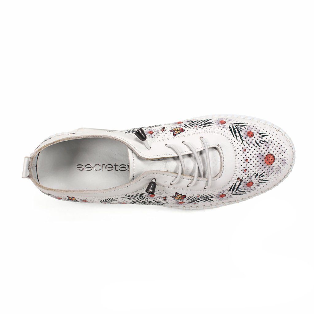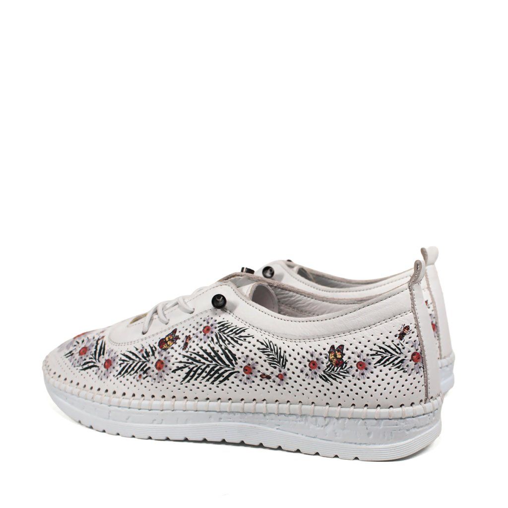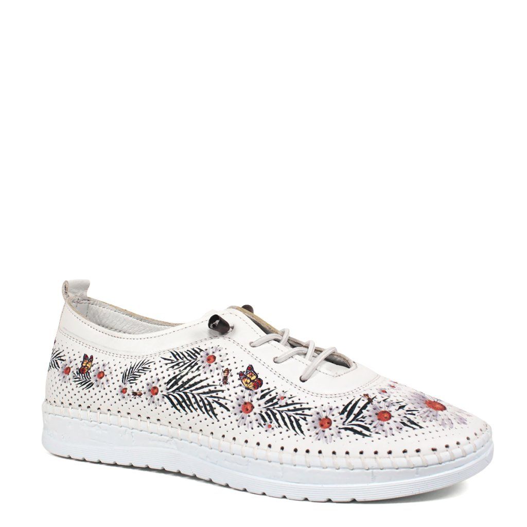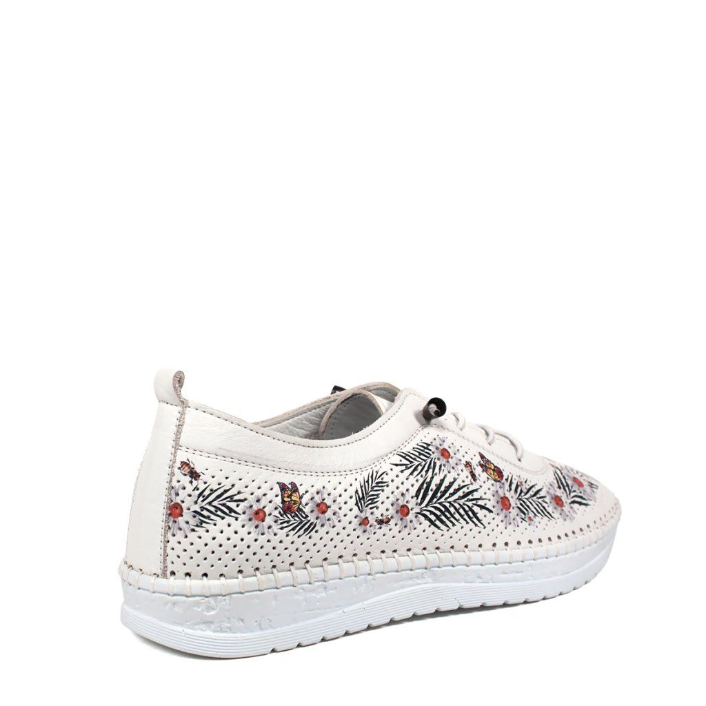 Ez a bájos fehér női bőr cipő igazi ékessége a tavaszi és nyári ruhatárnak. A cipő különlegessége a finom perforációban és a romantikus virág- és pillangómintában rejlik, amely nemcsak esztétikus, hanem a lyukacsos kialakításnak köszönhetően kiváló szellőzést is biztosít a lábnak a melegebb napokon. A puha, rugalmas talp és a kényelmes fűzés egész napos kényelmet garantál, legyen szó városi sétáról vagy munkanapról. A markáns varrás a talp körül kézműves jelleget kölcsönöz a cipőnek, így remekül mutat farmerral, vászonnadrággal vagy akár egy könnyű nyári ruhával is.