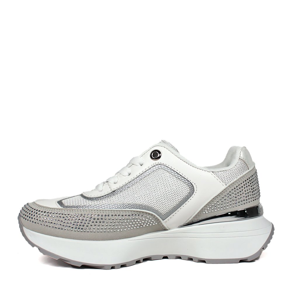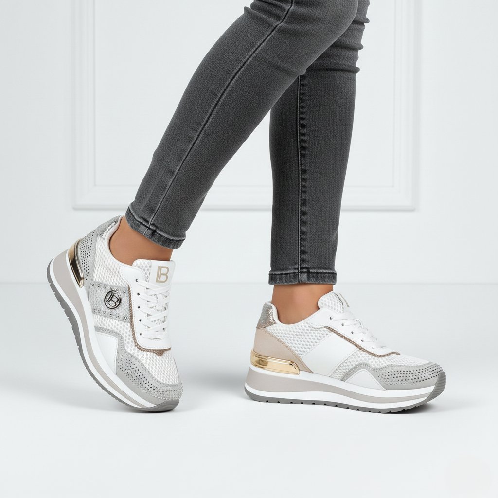 Ezek a csillogó, fehér-ezüst színű Laura Biagiotti női sportcipők a futurisztikus elegancia és a sportos luxus mesteri ötvözetei. A cipő kivételességét a gazdagon alkalmazott, csillogó kristályokkal díszített szürke panelek a lábujjakon és a sarkon adják, így minden lépésnél figyelmet keltenek. A modern dizájnt a "LB" kerek fém logó egészíti ki az oldalsó részen, valamint egy ezüst díszcsík a sarkon. A masszív, fehér platform talp nemcsak divatos megjelenést kölcsönöz, hanem kiváló kényelmet és stabilitást is biztosít, így ideális választás azoknak a hölgyeknek, akik a hétköznapokon is ragyogni szeretnének.