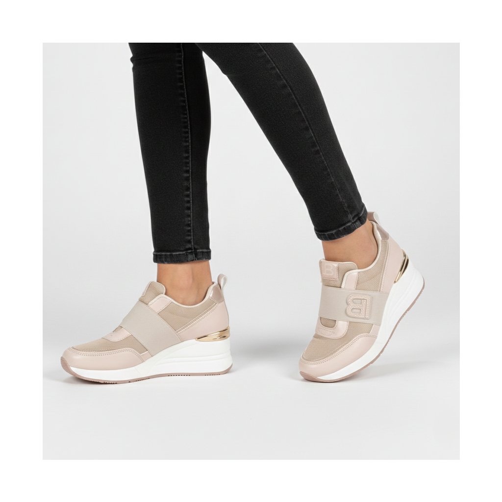 Ez a gyönyörű, nude színű Laura Biagiotti női cipő a sportos kényelem és a kifinomult elegancia tökéletes kombinációja. A cipő különlegességét a csillogó textil betétek és a rosegold színű részletek adják, amelyeket a saroknál található márkajelzéssel ellátott fém dísz tesz teljessé. A bebújós kialakítás rugalmas pánttal nemcsak divatos megjelenést kölcsönöz, hanem gyors és egyszerű felvételt is garantál. A megemelt fehér talp extra kényelmet és nőies tartást biztosít egész nap, így ideális választás városi sétákhoz és elegánsabb mindennapi viselethez egyaránt.