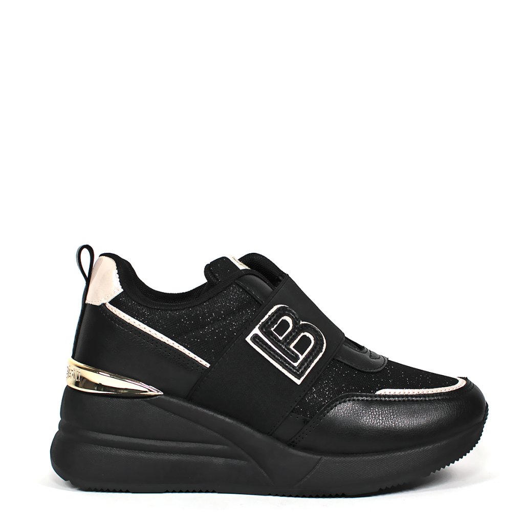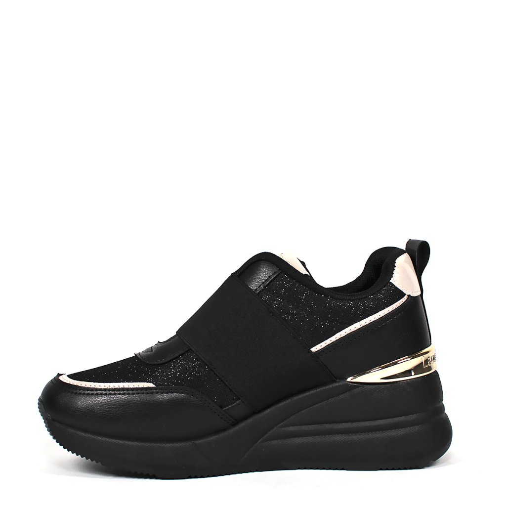 Ez a lenyűgöző fekete Laura Biagiotti cipő magabiztos stílust és modern luxust testesít meg. A mély fekete alapszínt élénk, csillogó textúrák és elegáns arany részletek díszítik, amelyek mind a cipő orrán, mind a sarkán megjelennek. A lábbeli központi eleme egy széles, rugalmas pánt, melyen feltűnő, strasszokkal díszített márkalogó található, ami nemcsak stabil tartást biztosít, hanem ékszerként is funkcionál. A robusztus, ugyanakkor könnyű fekete talp és a megemelt sarok egész napos kényelmet biztosítanak, miközben optikailag hosszabbítják a lábakat, így tökéletes kiegészítői egy merész városi megjelenésnek.