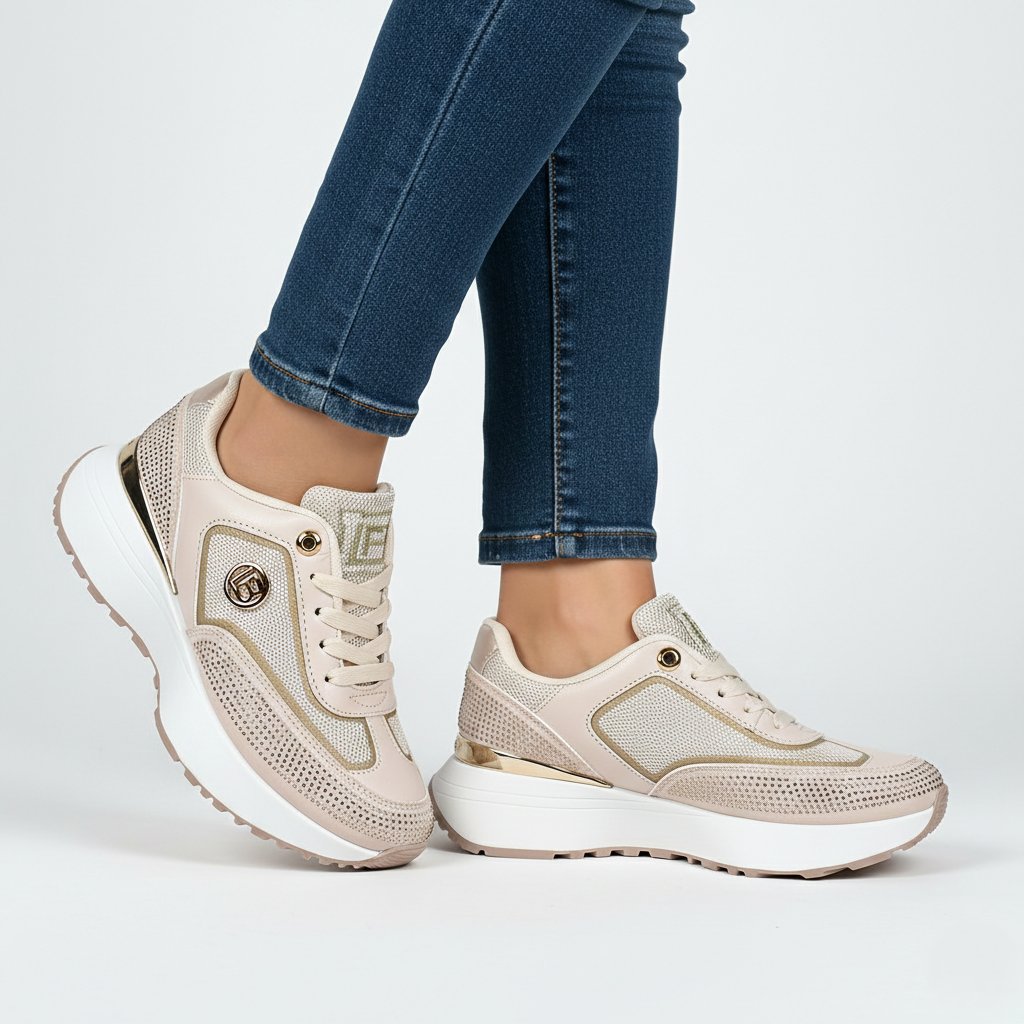 Ez a kivételes Laura Biagiotti női cipő a sportos kényelem és a prémium elegancia tökéletes ötvözetét kínálja. A cipő finom bézs árnyalatait csillogó kövek és elegáns arany részletek emelik ki, míg az oldalsó ikonikus monogram logó márkás megjelenést biztosít. A megemelt fehér talp nemcsak magabiztos járást és extra magasságot biztosít, hanem egész napos kényelmet is nyújt a lábaknak. Kiváló választás mindazok számára, akik egy csipetnyi luxust és csillogást szeretnének vinni mindennapi öltözékükbe.