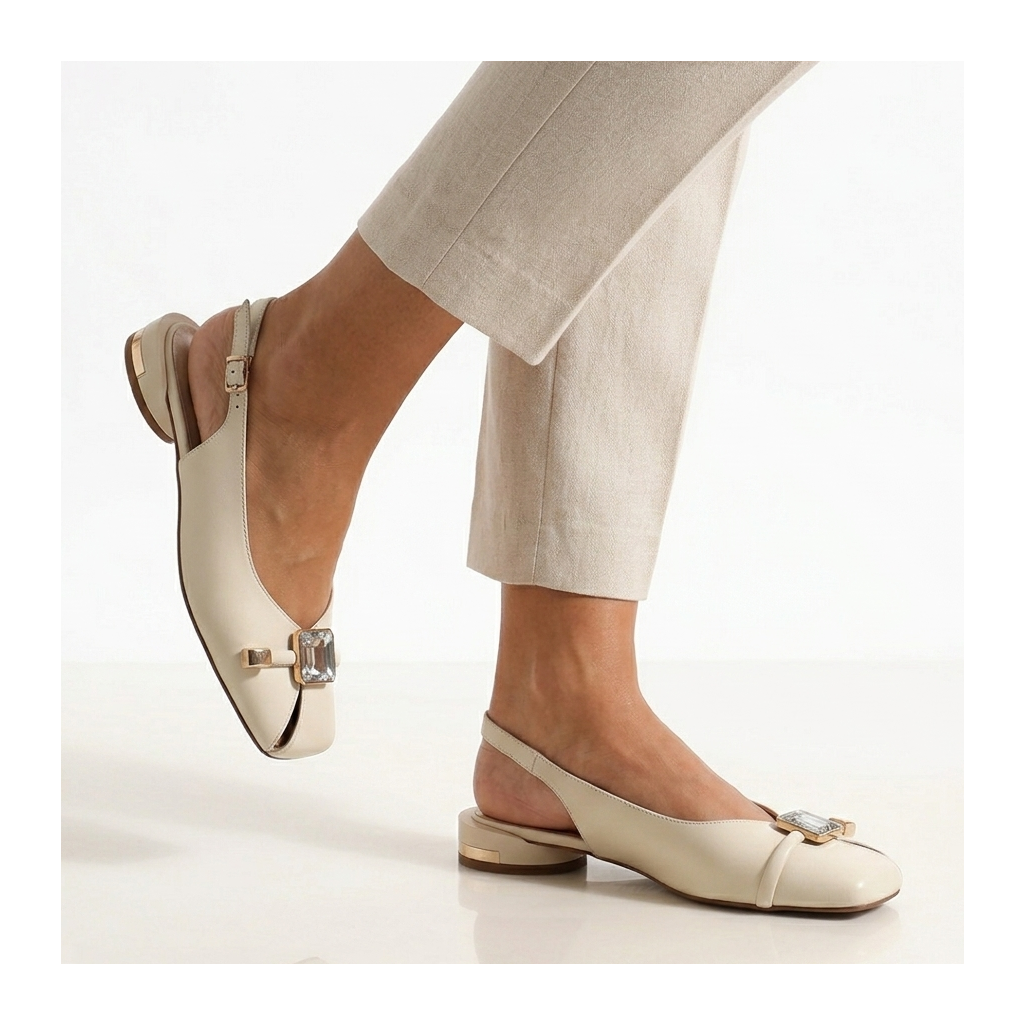 Ez a kifinomult, halvány krémszínű szandál tökéletesen ötvözi a modern dizájnt és az egész napos kényelmet. A meghatározó elem a feltűnő kristálydíszítés és az egyedi szögletes orr, amelyek luxusérzetet kölcsönöznek a cipőnek.