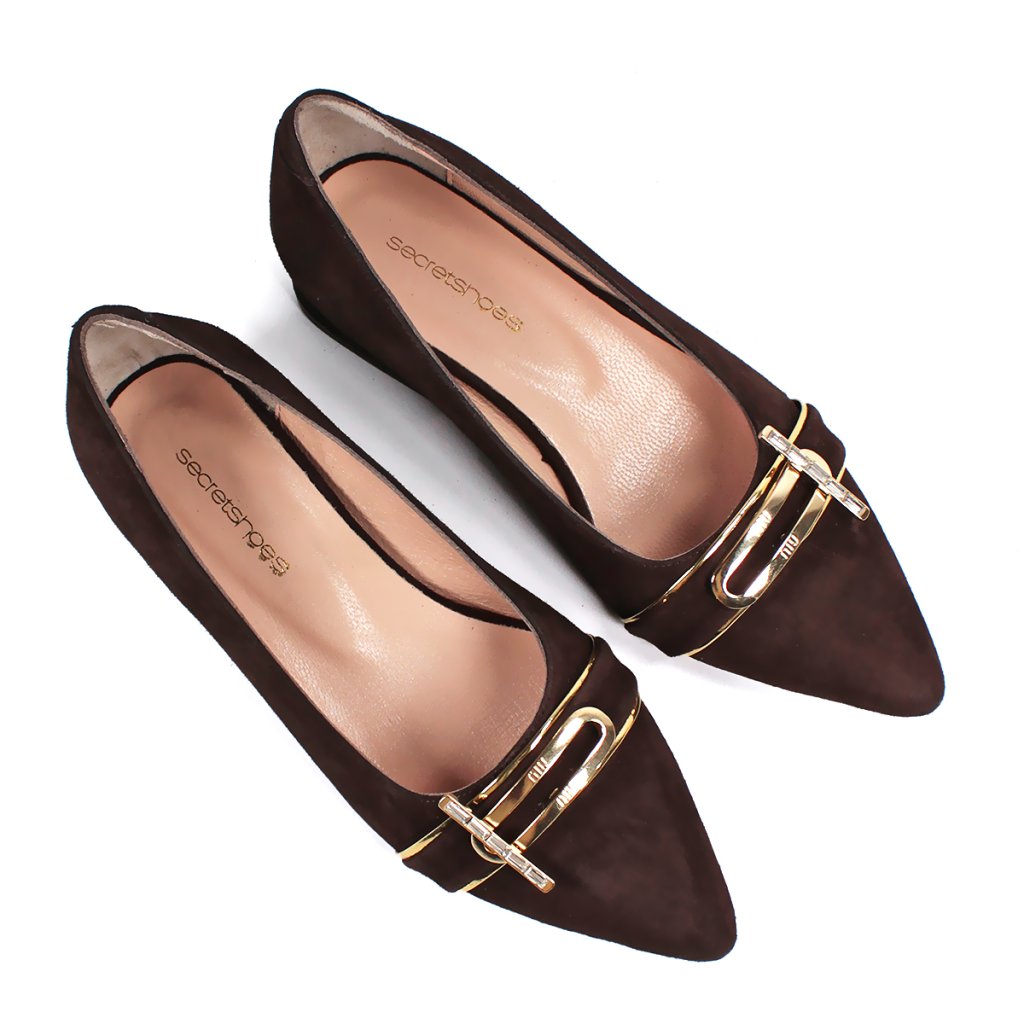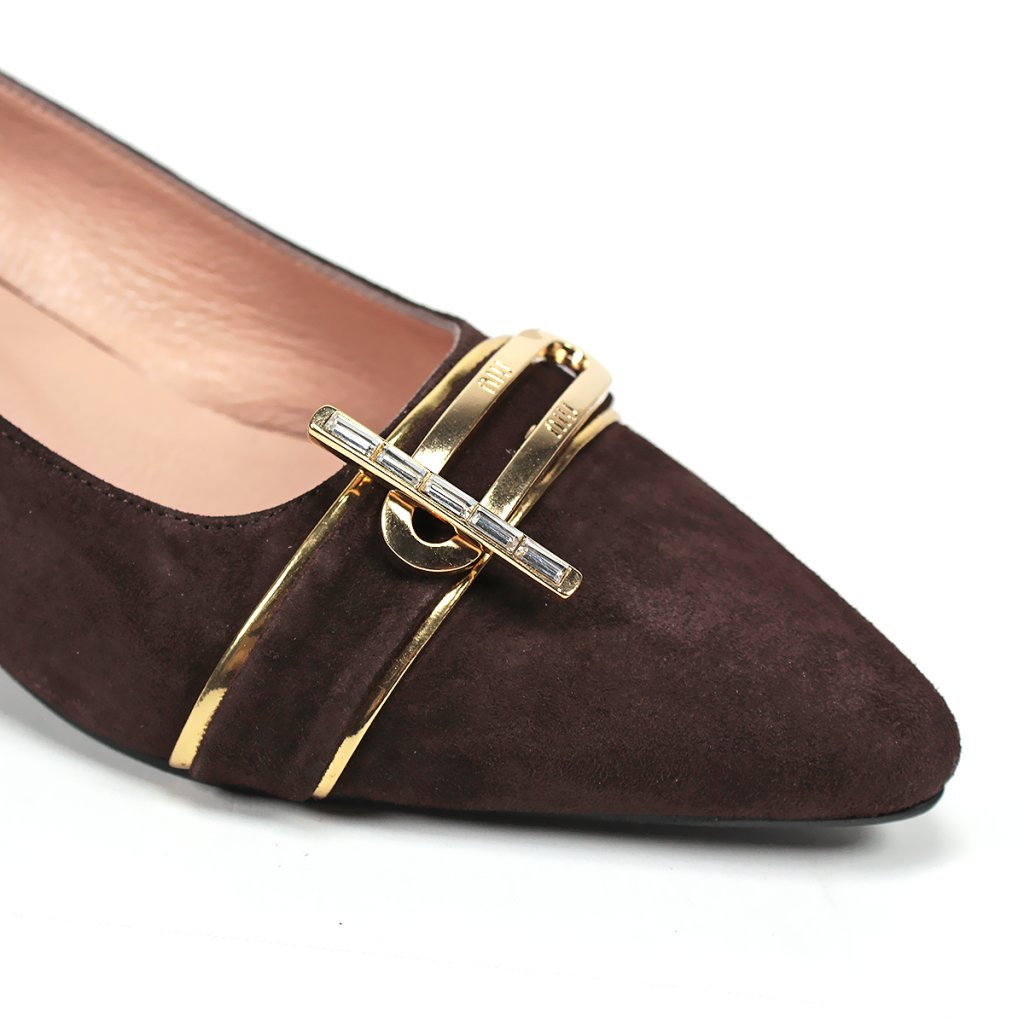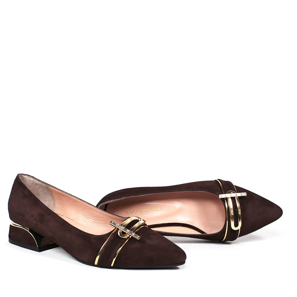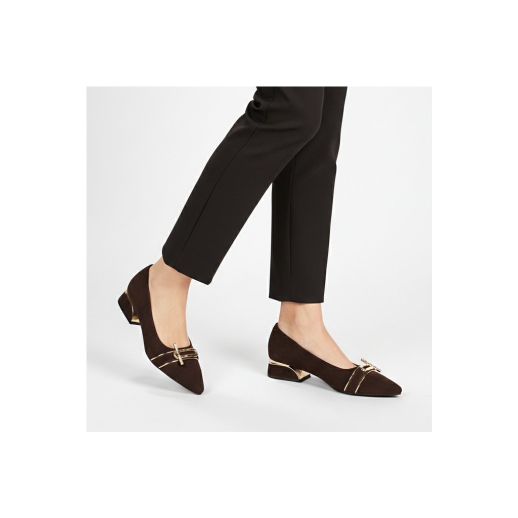 Ez az elegáns női cipő mély csokoládébarna árnyalatban a tiszta luxust és a mindennapi kényelmet ötvözi. A finom velúr felsőrészt egy nőies, hegyes orr egészíti ki, amelyet a lábfejen egyedi arany fém díszítés koronáz. Ezeknek a cipőknek az igazi ékessége az alacsony, stabil tömbsarok, amelynek belső oldala feltűnő arany részlettel díszített, így viselőjének minden lépésnél kivételes fényt kölcsönöz. A puha, természetes színű belső bélés kényelmet garantál, így ez a modell tökéletes kiegészítője lehet elegáns kosztümöknek vagy sötétebb tónusú alkalmi ruháknak.