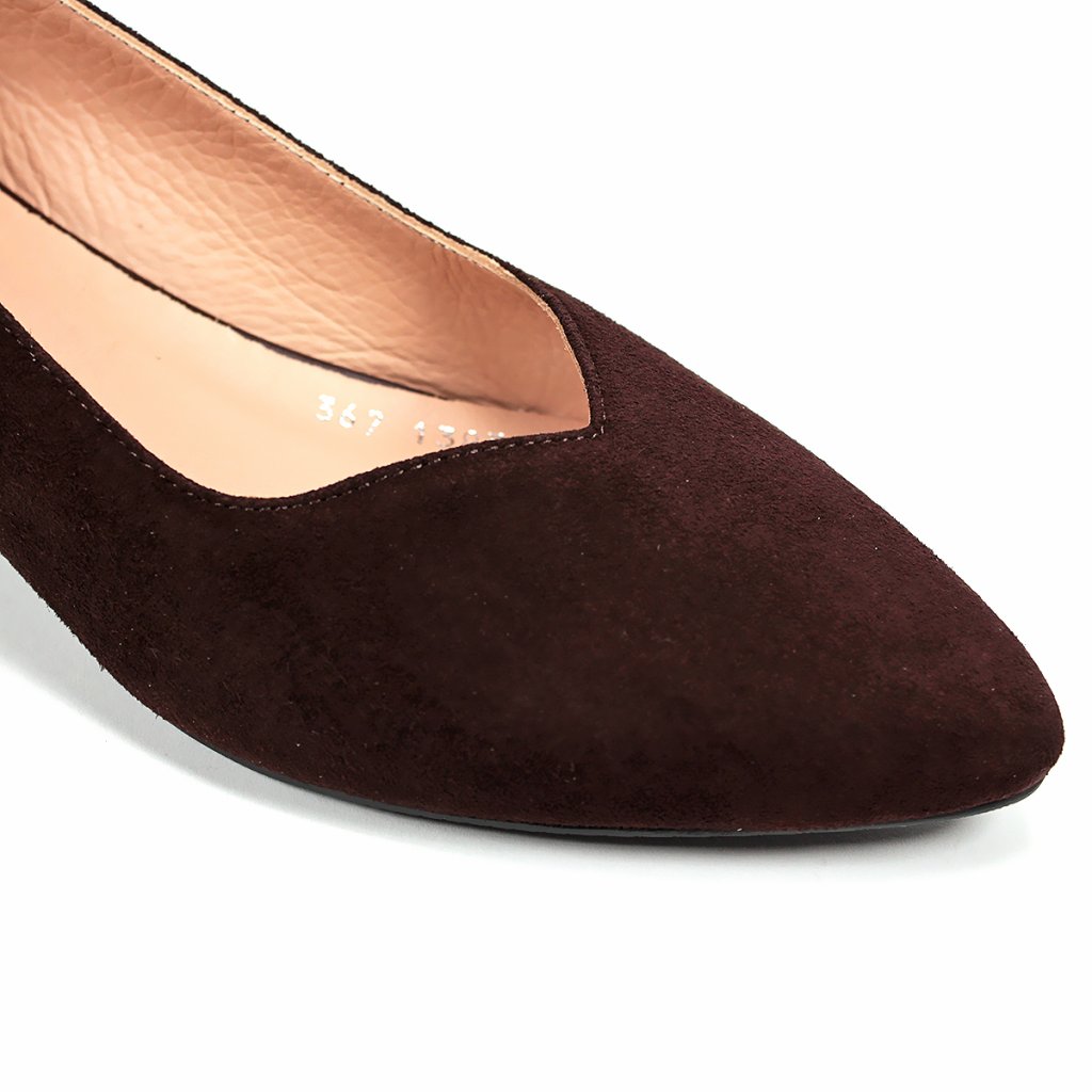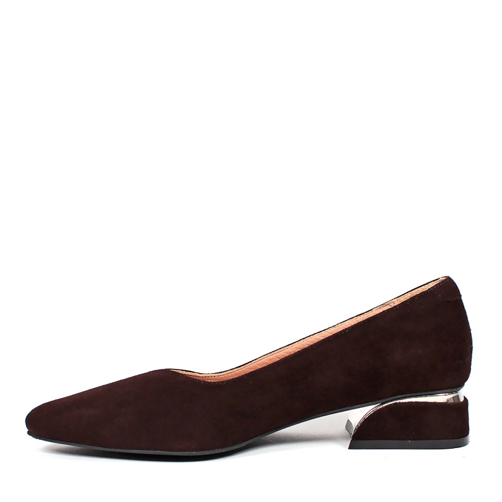 Ez a Secretshoes márkájú, sötét, mélybarna velúr textúrájú magassarkú elegáns, időtlen stílust képvisel modern dizájnnal párosítva. A cipő kivételessége az egyedi, geometrikus sarokban rejlik, amely a fényes króm részletnek köszönhetően igazán figyelemfelkeltő és futurisztikus. A finoman hegyes orr és az elegáns vonalak kecses megjelenést kölcsönöznek a lábnak, míg az alacsony sarok és a minőségi belső kidolgozás kényelmet biztosít hosszú munkanapok vagy esti rendezvények során. Ez a modell ideális választás azoknak a hölgyeknek, akik a klasszikus színeket keresik a modern stílus egy csipetnyi eleganciájával.