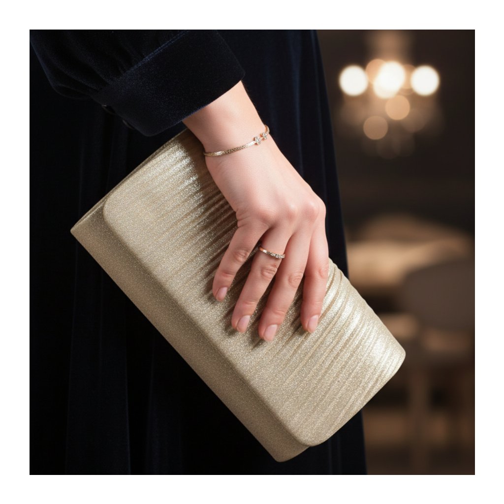 Ez a stílusos alkalmi táska tökéletes kiegészítő minden ünnepi alkalomra, legyen szó esküvőről, bálról vagy egy fontos esti eseményről. A táska különlegessége az elülső fedélen található finom redőzés, amely selymes fényének és textúrájának köszönhetően azonnal felhívja magára a figyelmet. A levéltáska stílusú, mágneses záródású, merev konstrukciója biztosítja a holmijai biztonságát, miközben elegendő helyet kínál telefonnak, iratoknak vagy rúzsnak. A belső fülek lehetővé teszik a lánc csatlakoztatását, így kézben és vállon is viselhető.