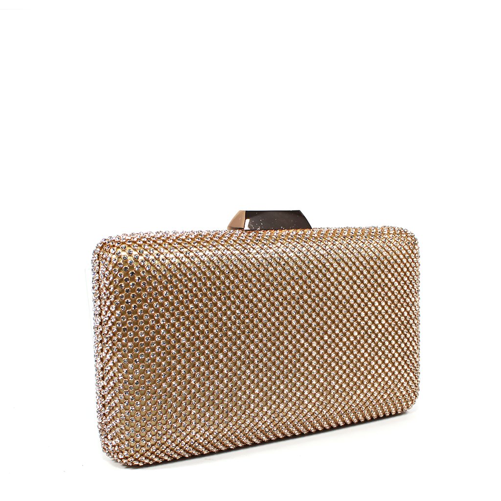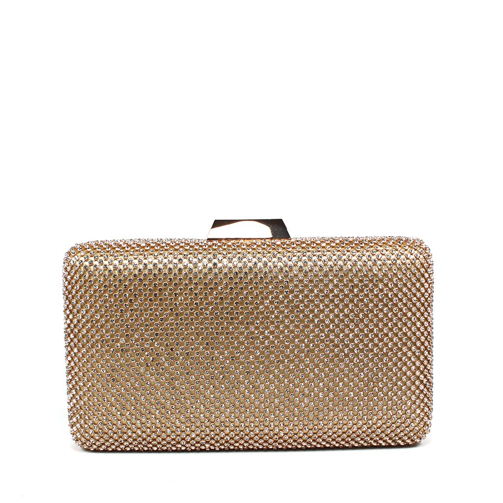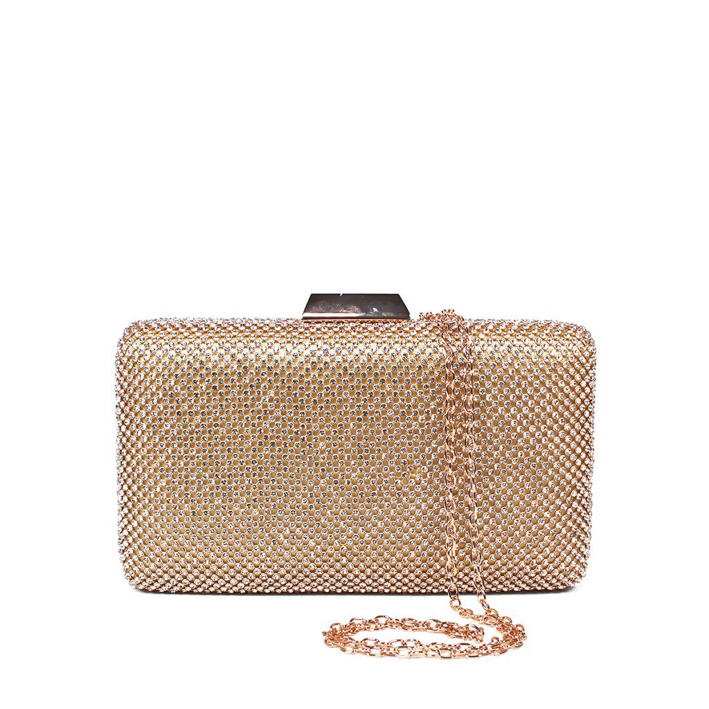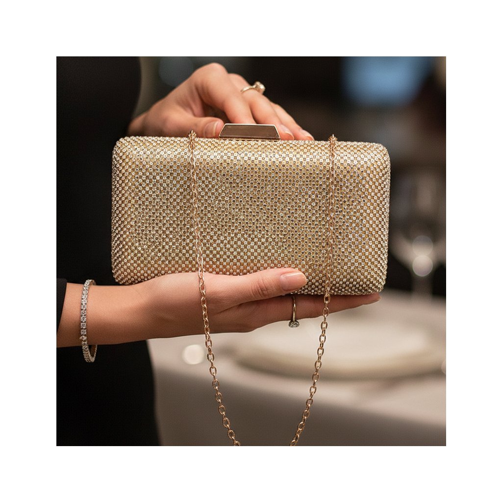 Emelje új szintre ünnepi megjelenését ezzel a lenyűgöző, arany tónusú alkalmi táskával, amely úgy ragyog majd a kezében, mint egy igazi ékszer. A táska teljes felületét apró, csillogó kövek borítják sűrűn, amelyek minden fényviszony mellett elbűvölő luxust sugároznak. A letisztult, szögletes dizájnt elegáns arany fémkeret és modern felső csat egészíti ki. A finom arany láncnak köszönhetően a táskát kényelmesen vállon is viselheted, így tökéletes társ a menyegzőkre, estélyekre vagy bármilyen rangos eseményre. Ez a kompakt, mégis feltűnő darab garantáltan a figyelem középpontjába állítja viselőjét.