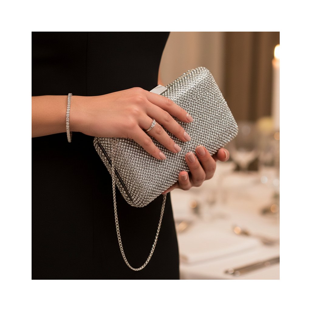 Emeld új szintre ünnepi megjelenésedet ezzel a káprázatos, ezüst tónusú alkalmi clutch-csal, amely úgy ragyog majd a kezedben, mint egy igazi ékszer. A táska teljes felületét apró, csillogó kövek borítják sűrűn, amelyek minden fényviszony mellett elbűvölő luxust sugároznak. A letisztult, szögletes dizájnt elegáns arany fémkeret és modern felső csat egészíti ki. A finom arany láncnak köszönhetően a táskát kényelmesen vállon is viselheted, így tökéletes társ a menyegzőkre, estélyekre vagy bármilyen rangos eseményre. Ez a kompakt, mégis feltűnő darab garantáltan a figyelem középpontjába állítja viselőjét.
