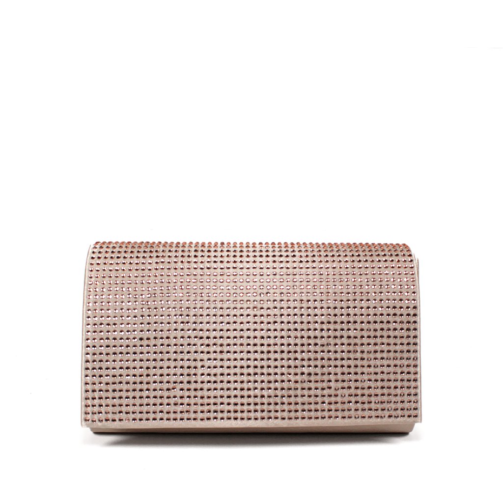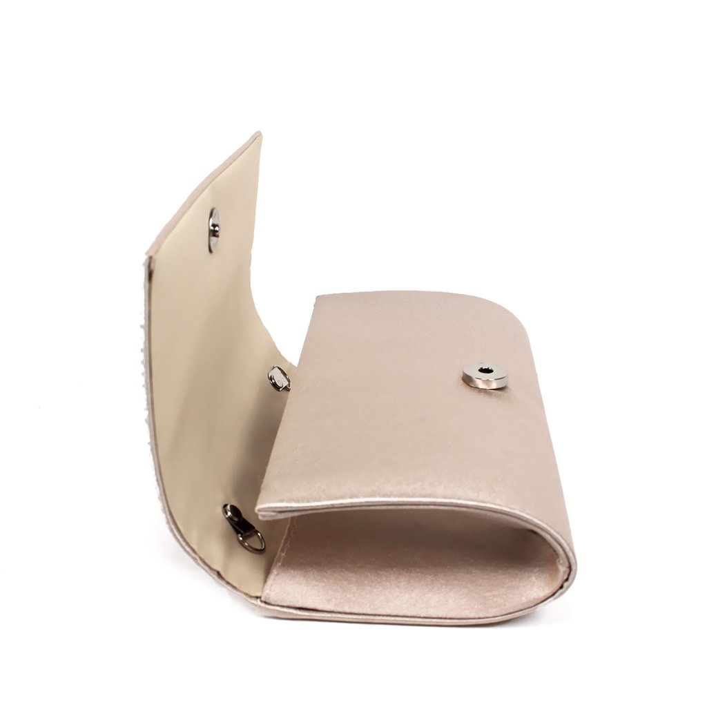 Tegye ragyogóbbá megjelenését ezzel a kifinomult alkalmi táskával, finom púderes-rózsaszín árnyalatban, szatén fényű. Az elejét sűrűn elhelyezett csillogó strasszkövek díszítik, amelyek luxus és elegáns megjelenést kölcsönöznek a kiegészítőnek. A letisztult vonalvezetésű clutch praktikus mágnessel záródik, és bőséges helyet biztosít legfontosabb apróságai számára. A levehető ezüst láncnak köszönhetően kényelmesen vállon is viselhető, így ideális választás esküvőkre, bálokra vagy bármilyen más különleges alkalomra.