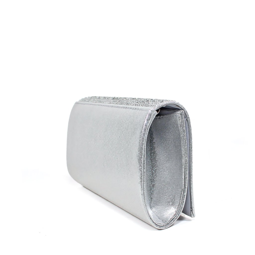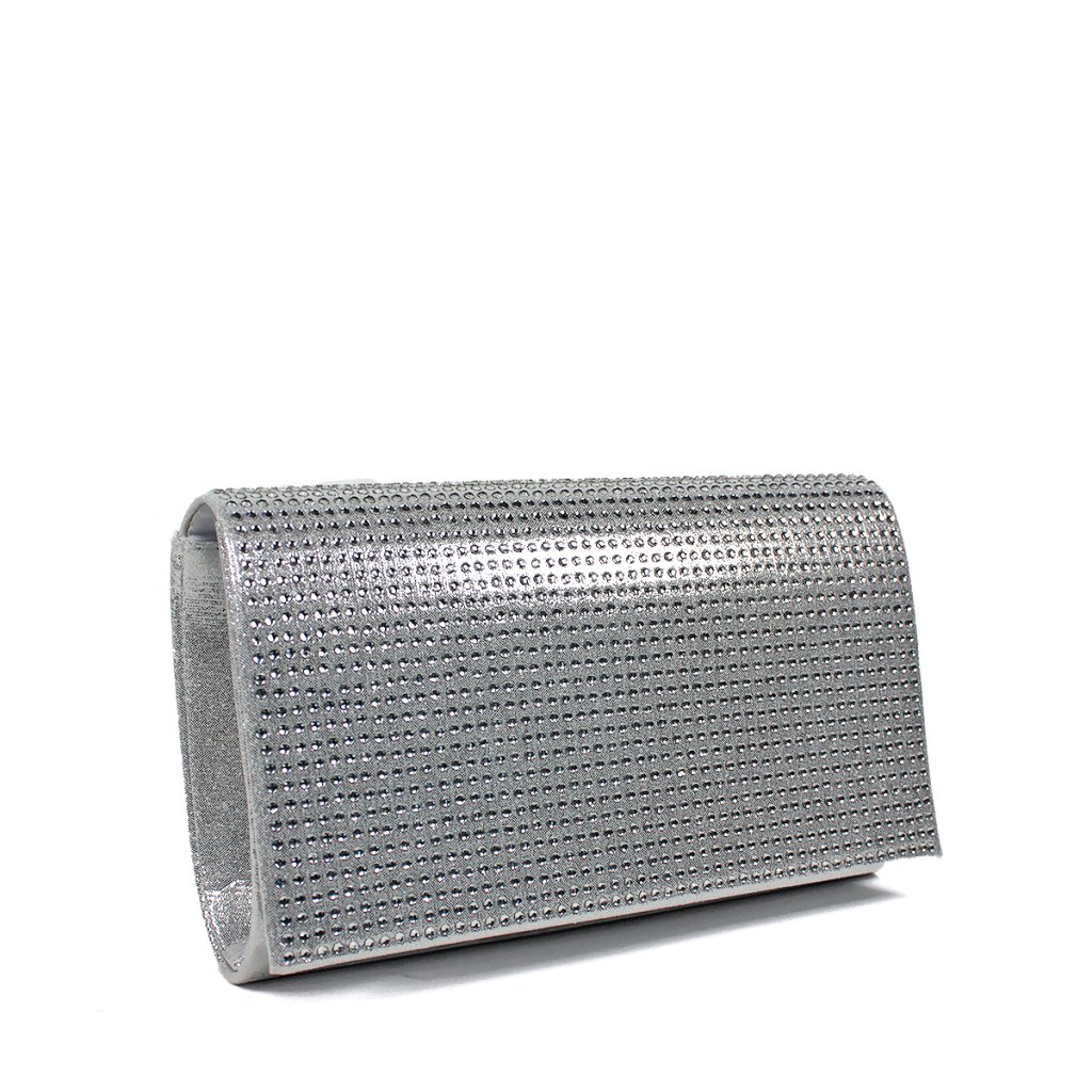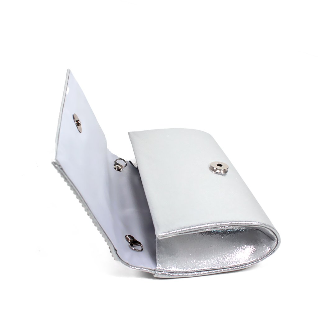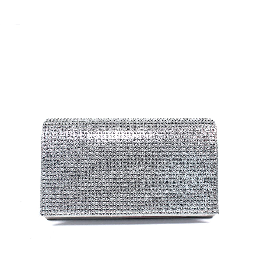Díszítse megjelenését ezzel a kifinomult, finom ezüst árnyalatú, szatén fényű alkalmi táskával. Az elejét sűrűn elhelyezett csillogó strasszkövek díszítik, amelyek luxus és elegáns megjelenést kölcsönöznek a kiegészítőnek. A letisztult vonalvezetésű clutch praktikus mágnessel záródik, és bőséges helyet biztosít legfontosabb apróságai számára. A levehető ezüst láncnak köszönhetően kényelmesen vállon is viselhető, így ideális választás esküvőkre, bálokra vagy bármilyen más különleges alkalomra.