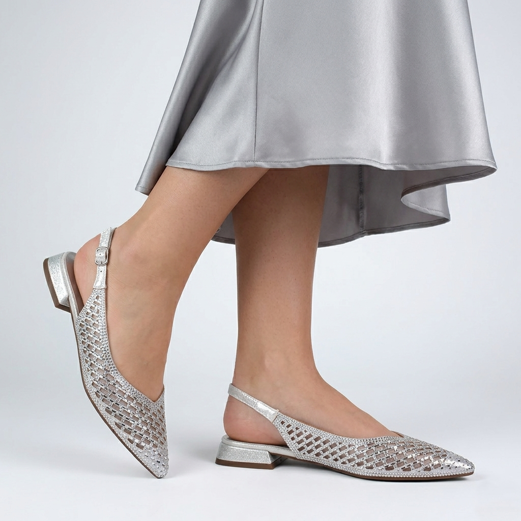 Ez a gyönyörű Menbur márka nyitott sarkú magassarkúja a kifinomult elegancia és a modern kényelem ötvözete, így ideális választás különleges alkalmakra vagy esti eseményekre. Az ezüst színű, finom mintázatú felsőrész gazdagon díszített csillogó kövekkel, amelyek lélegzetelállító hatást keltenek, míg a hegyes orr és a kecses vonalak optikailag hosszabbítják a lábakat. Az állítható sarokpánt és az alacsony, stabil tömbsarok egész napos kényelmet biztosítanak, így korlátozások nélkül ragyoghatsz. Ez a stílusos lábbeli azonnal ünnepélyes hangulatot kölcsönöz minden társasági öltözéknek.