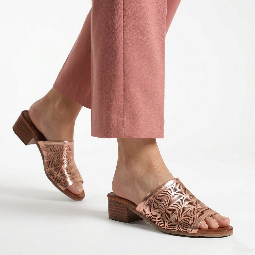 Ez a kivételes, rózsaarany árnyalatú női papucs a modern elegancia és a kényelem tökéletes kombinációja. A fémfényű felsőrész precíz, lézerrel vágott levélmintával díszített, amely nemcsak látványos textúrát kölcsönöz a cipőnek, hanem kiváló szellőzést is biztosít a meleg nyári napokon. Az alacsony, stabil, fa dekorációval ellátott sarok egész napos kényelmet garantál, miközben finoman megemeli az alakot. A párnázott belső talp és a nyitott orr gondoskodik a mozgás szabadságának érzetéről, így ez a modell ideális választás alkalmi öltözetekhez, valamint elegánsabb ruhák kiegészítéseként is.