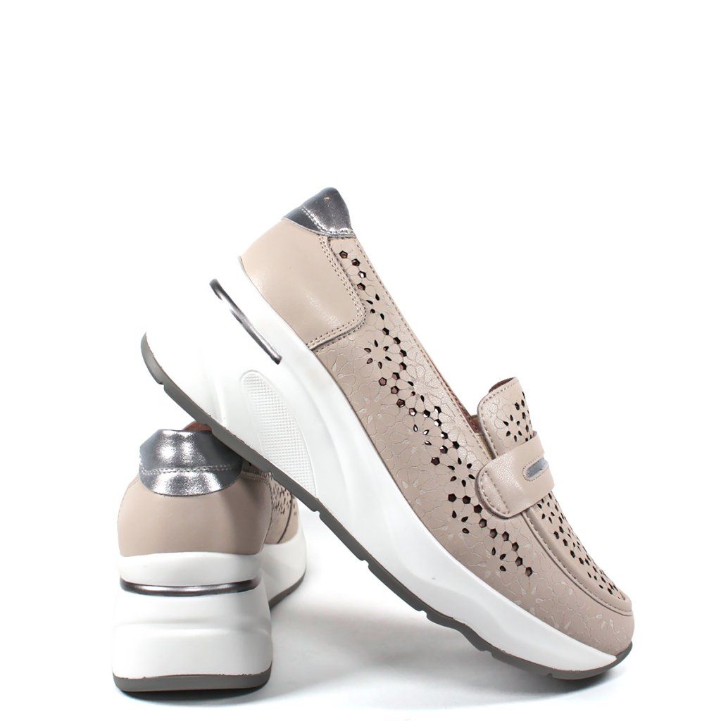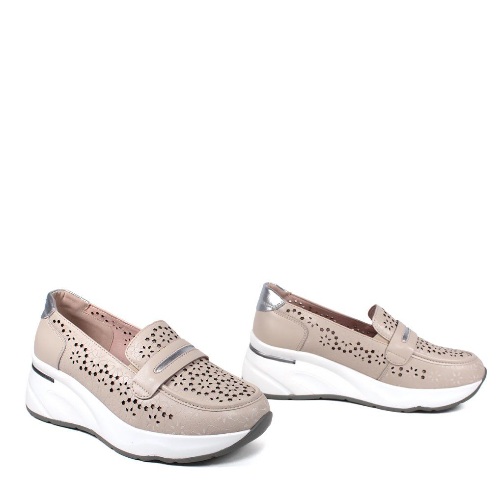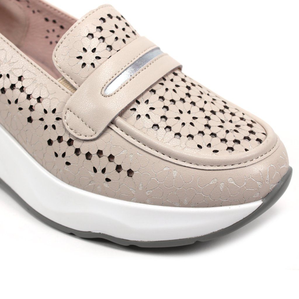 Ez a stílusos bézs női félcipő tökéletes kombinációja a modern eleganciának és a sportos kényelemnek. A bőr felsőrészt részletes, lézerrel kivágott, virágmintás perforáció díszíti, amely nemcsak egyedi megjelenést kölcsönöz a cipőnek, hanem kiváló légáteresztést is biztosít a melegebb napokon. Az ezüst részletek a saroknál és a díszítő pánton finom fényt adnak a dizájnnak. A tömör fehér platform talp extra magasságot és egész napos kényelmet biztosít, így ez a modell ideális választás a mozgalmas munkanapokra és a laza városi viseletre egyaránt.