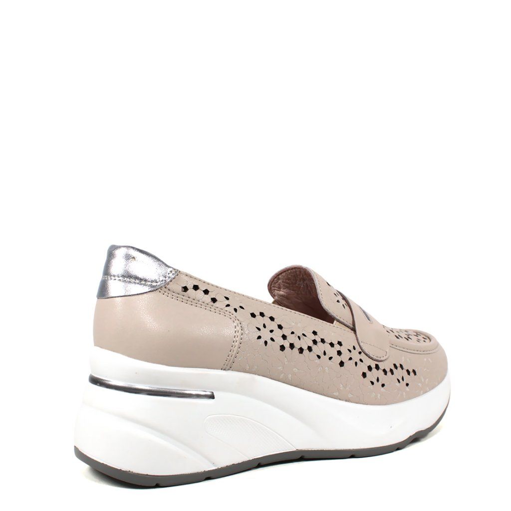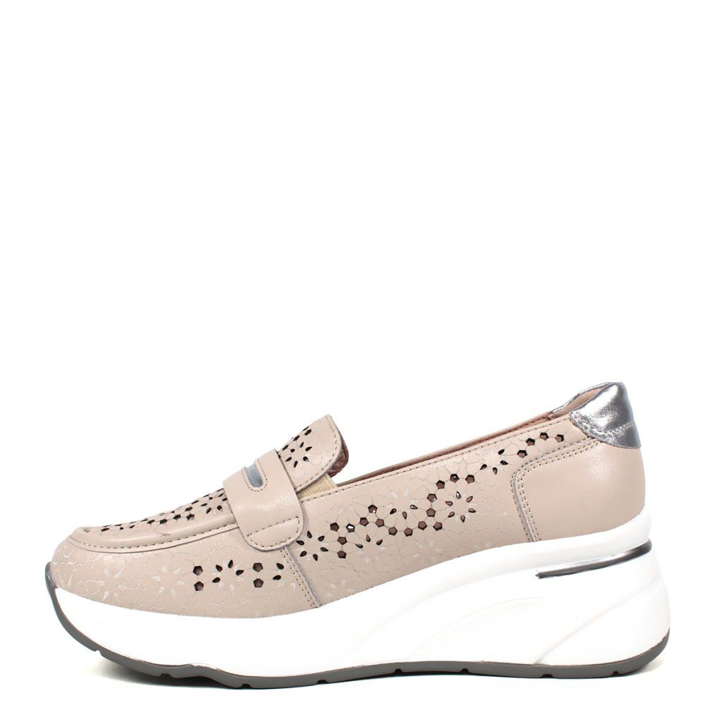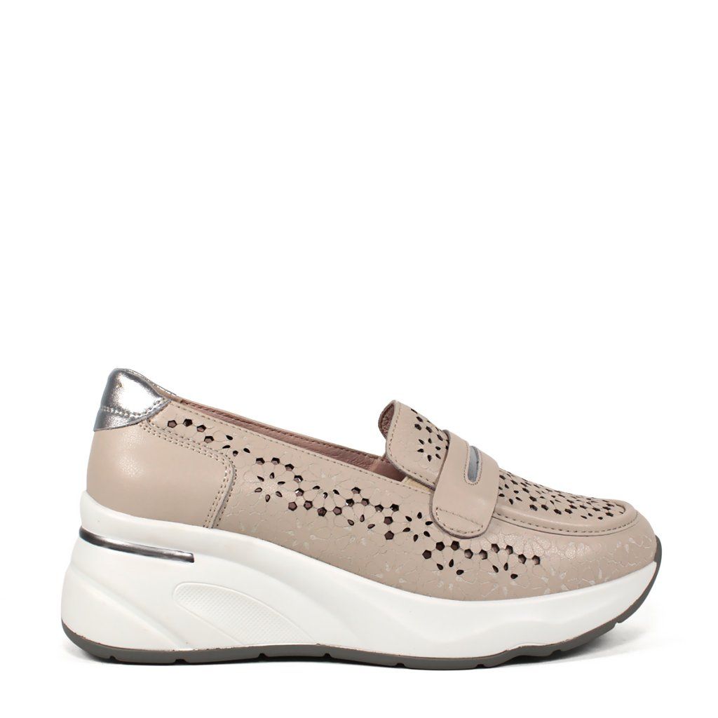 Ez a stílusos bézs női félcipő tökéletes kombinációja a modern eleganciának és a sportos kényelemnek. A bőr felsőrészt részletes, lézerrel kivágott, virágmintás perforáció díszíti, amely nemcsak egyedi megjelenést kölcsönöz a cipőnek, hanem kiváló légáteresztést is biztosít a melegebb napokon. Az ezüst részletek a saroknál és a díszítő pánton finom fényt adnak a dizájnnak. A tömör fehér platform talp extra magasságot és egész napos kényelmet biztosít, így ez a modell ideális választás a mozgalmas munkanapokra és a laza városi viseletre egyaránt.