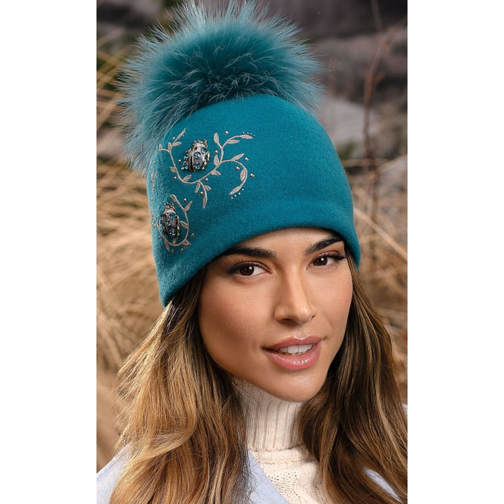 Különlegesen egyedi női sapka, puha, tanúsítvánnyal rendelkező Woolmark gyapjúból – tökéletesen illeszkedik minden fejmérethez. A gazdag díszítés magában foglalja a bogarakat és arany hímzéssel készült, levelekkel díszített ágakat. Az egészet egy ugyanolyan színű, természetes mosómedve kutyapompon egészíti ki. A termék tökéletes kiegészítője lesz az őszi-téli kollekciójának