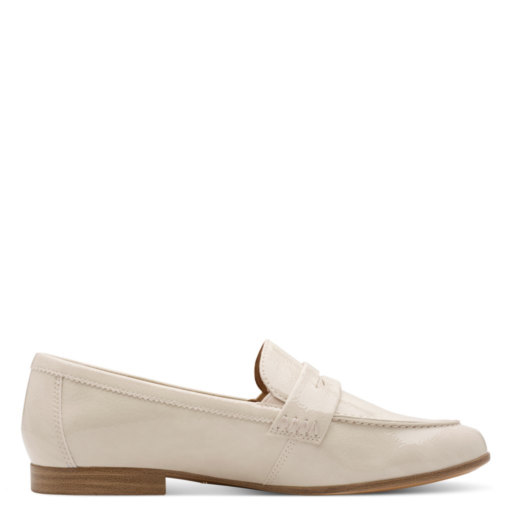Ez a Tamaris lakkozott mokaszin a klasszikus elegancia és a modern luxus tökéletes ötvözete. A finom elefántcsont árnyalat és a magasfényű felület kifinomult megjelenést kölcsönöz a cipőnek, amely azonnal feldobja bármely üzleti vagy alkalmi viseletet.