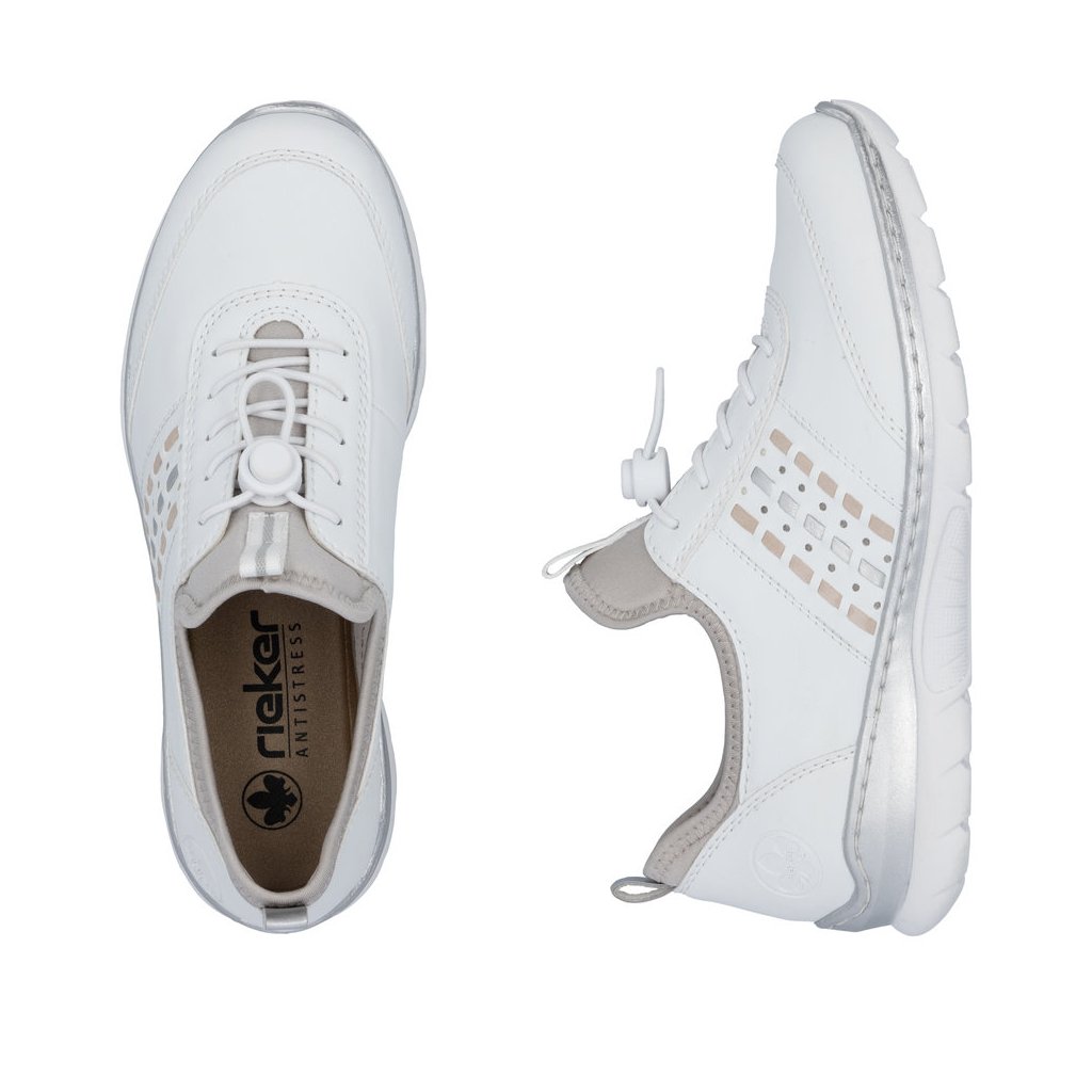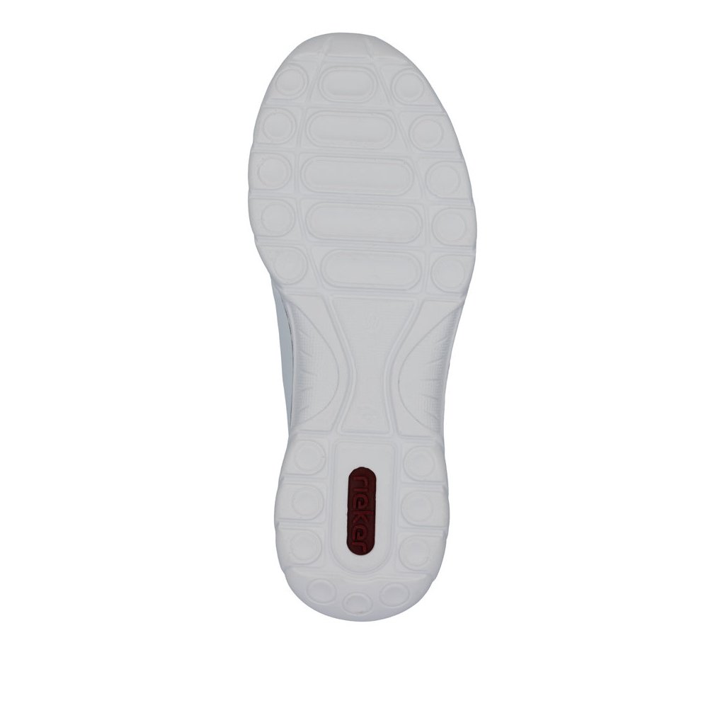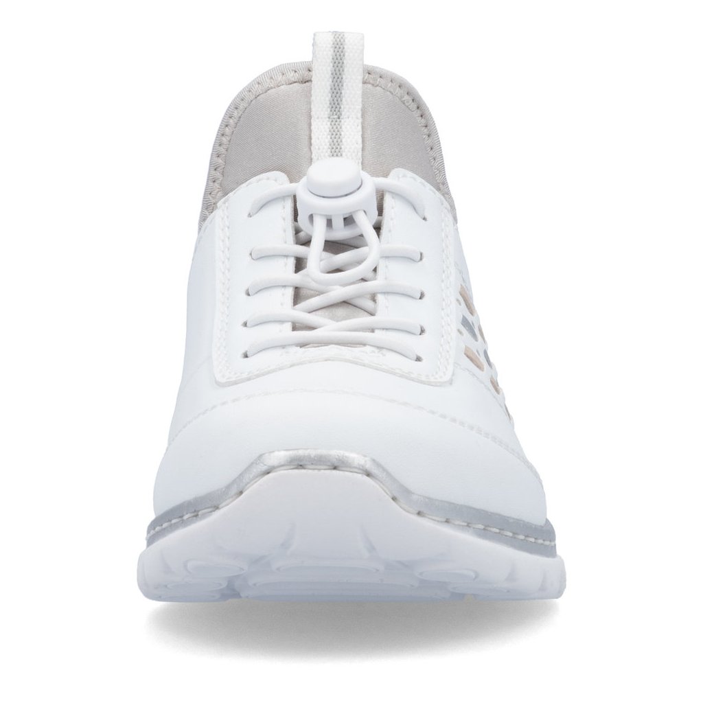 Ez az egyedülálló RIEKER márkájú cipő tökéletesen ötvözi a modern dizájnt és a maximális kényelmet, amit minden nő értékelni fog a mindennapi városi séták során, munkahelyen vagy szabadidőben. A fehér felsőrész gondosan kidolgozott, részletekre ügyelve – az oldalsó rátétek és a talp pereme finom ezüstös csillogással teszik a modellt ötletessé és figyelemfelkeltővé. A rugós szegéllyel ellátott praktikus, gumis fűzőzés lehetővé teszi a gyors és kényelmes felvételt, miközben a cipő tökéletesen illeszkedik a láb formájához. A puha textil talpbetét minden lépésnél biztosítja a kényelmet, és a rugalmas, ütéselnyelő talppal együtt stabilitást és kényelmet nyújt egész napos viselet esetén is. Ez a modell nemcsak a mindennapi tevékenységekhez készült, hanem egyben feltűnő divatkiegészítőként is szolgál, amely feldobja az öltözékét és kiemeli személyes stílusát.