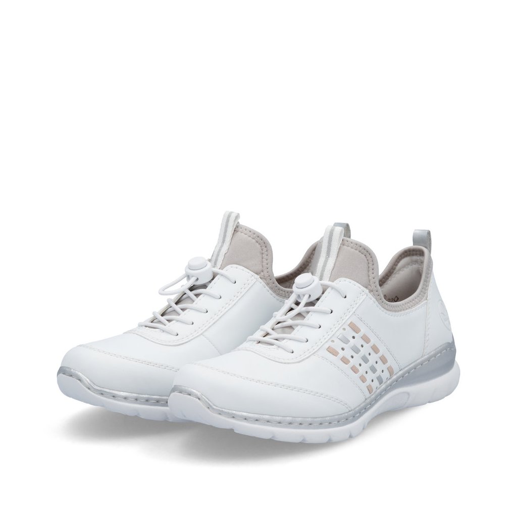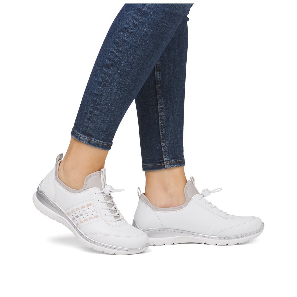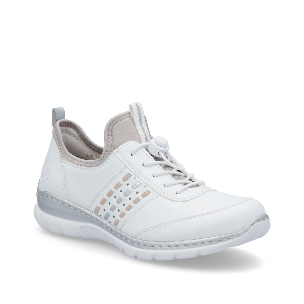 Ez az egyedülálló RIEKER márkájú cipő tökéletesen ötvözi a modern dizájnt és a maximális kényelmet, amit minden nő értékelni fog a mindennapi városi séták során, munkahelyen vagy szabadidőben. A fehér felsőrész gondosan kidolgozott, részletekre ügyelve – az oldalsó rátétek és a talp pereme finom ezüstös csillogással teszik a modellt ötletessé és figyelemfelkeltővé. A rugós szegéllyel ellátott praktikus, gumis fűzőzés lehetővé teszi a gyors és kényelmes felvételt, miközben a cipő tökéletesen illeszkedik a láb formájához. A puha textil talpbetét minden lépésnél biztosítja a kényelmet, és a rugalmas, ütéselnyelő talppal együtt stabilitást és kényelmet nyújt egész napos viselet esetén is. Ez a modell nemcsak a mindennapi tevékenységekhez készült, hanem egyben feltűnő divatkiegészítőként is szolgál, amely feldobja az öltözékét és kiemeli személyes stílusát.