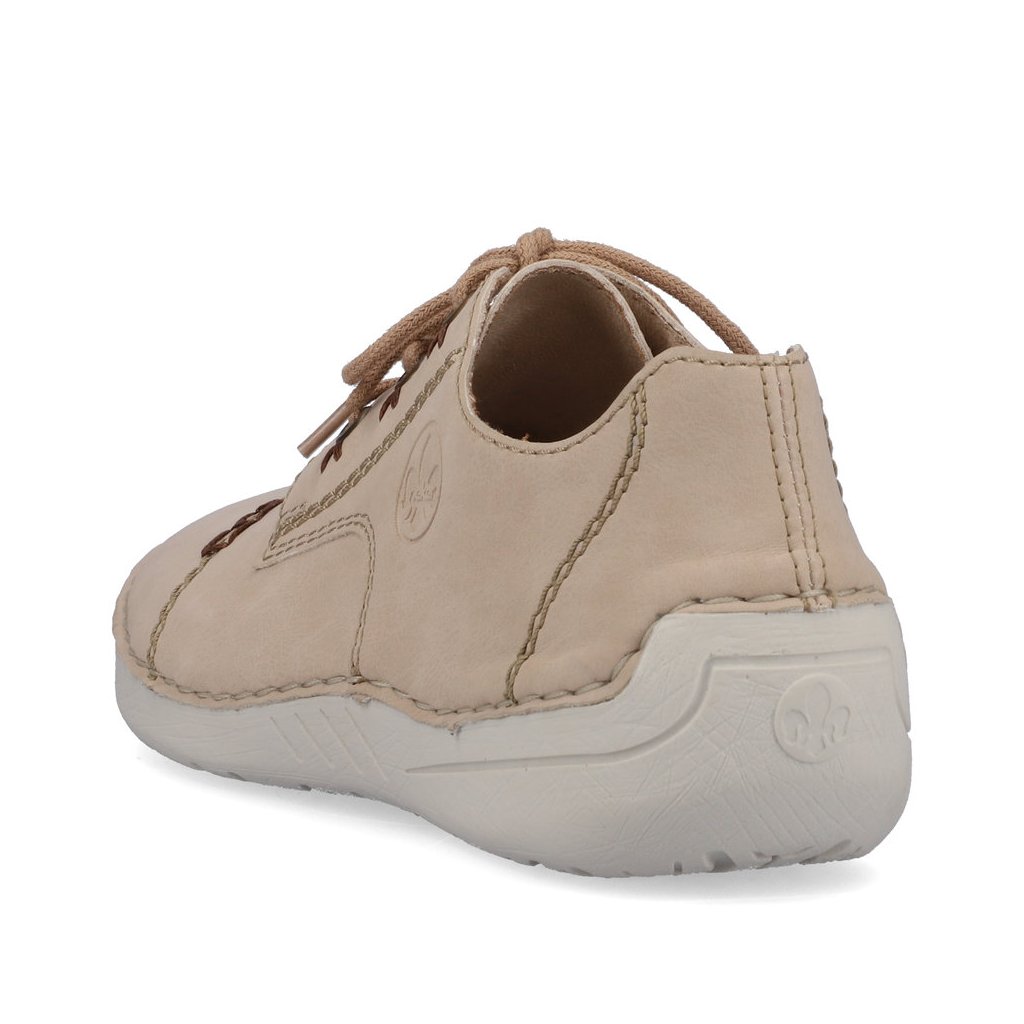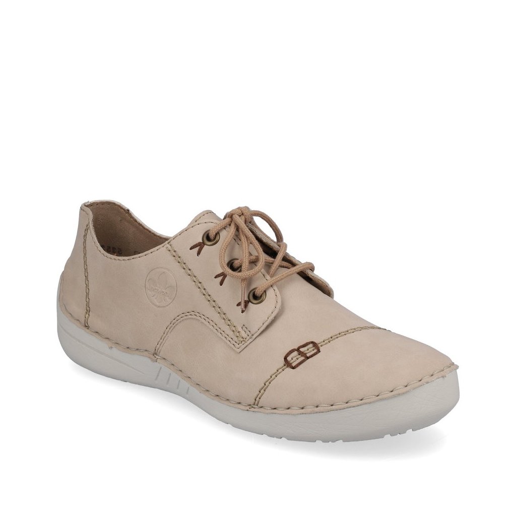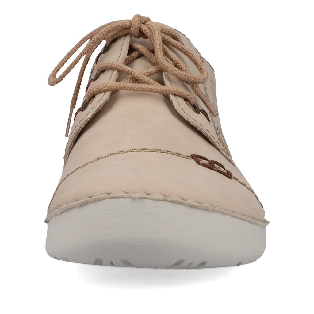 Rieker női cipő világos, időtlen kivitelben ötvözi a lezser dizájnt, a kényelmet és az átgondolt funkcionalitást. Az effektíven steppelt felsőrészt kontrasztos barna részletek és a külső oldalon található márkajelzés egészítik ki, amely az eredetiség finom aláírásaként hat. A fűzők lehetővé teszik a cipő precíz illeszkedését a lábfejhez, míg a puha bőr talpbetét tökéletes kényelmet és komfortot biztosít még egész napos viselet esetén is. Az Antistress technológiával ellátott talp könnyű, rugalmas és tompítja az ütések hatását járás közben, miközben támogatja a láb természetes mozgását és stabilitását minden lépésnél. A Rieker cipők nem csupán praktikus kiegészítők, hanem egy markáns stílusnyilatkozat is, amely feldobja minden öltözetet, és garantálja, hogy egész nap kényelmesen és stílusosan érezze magát.