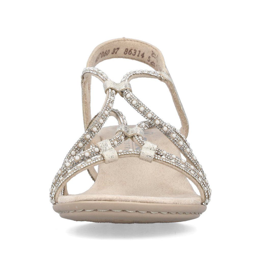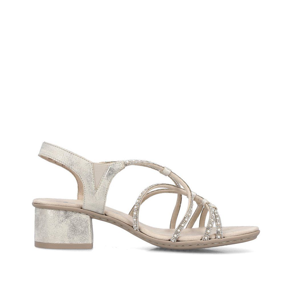 Ez a RIEKER szandál modell kivételes vizuális megjelenést ötvöz gondosan átgondolt funkcionalitással, így kedvelni fogják azok a nők, akik nem akarnak kompromisszumot kötni a stílus és a kényelem között. Csillogó pántjai elegánsan alkotnak egyedi vizuális egészet, amely azonnal felhívja magára a figyelmet, és szikrát és stílust kölcsönöz nyári öltözékének. A praktikus oldalsó gumipántok biztosítják a könnyű felvételt, valamint a cipő optimális illeszkedését a láb formájához, így egész nap kényelmesen érezheti magát. A puha talpbetét gondoskodik a kényelemről minden lépésnél, míg az alacsony és széles sarok kiemeli nőies báját a kényelem feláldozása nélkül. Dobja fel nyári ruhatárát ezekkel a szandálokkal, és legyen készen ragyogni minden lépésnél – akár városba, akár sétálni, akár nyári találkozóra indul barátaival.