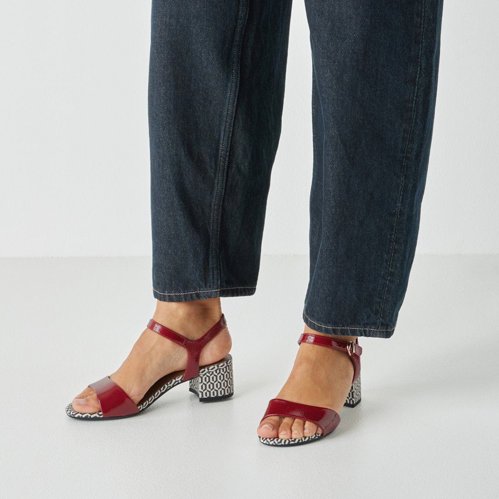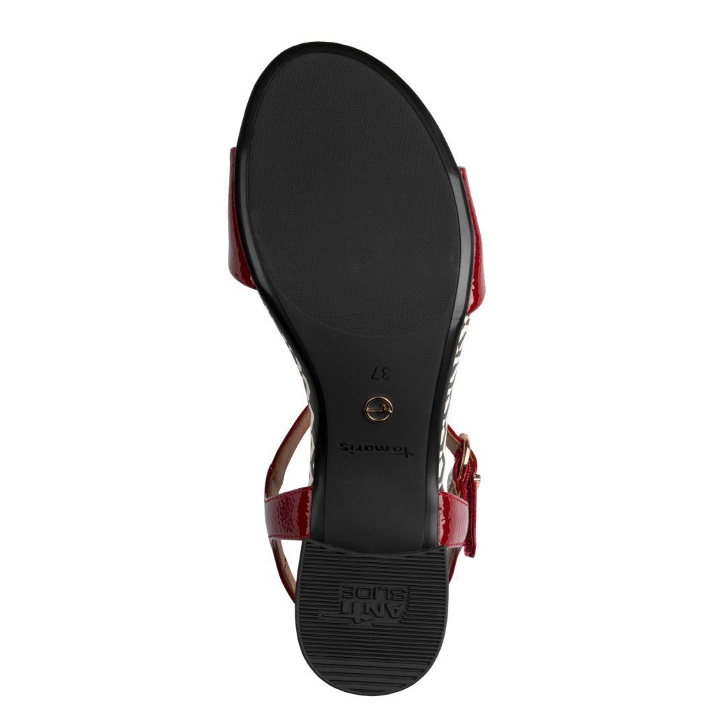 Ezek a Tamaris szandálok magabiztos stílus és modern dizájn tökéletes kombinációját kínálják, amely azonnal feldob bármilyen egyszerű szettet. A lakkozott hatású, élénkpiros műbőr felsőrész elegáns fényt kölcsönöz megjelenésének, míg a talpbetéten és a sarokrészen található fekete-fehér geometrikus minta modern, művészi hangulatot visz a dizájnba. A stabil tömbsarok kényelmes magasságot biztosít, a talpon elhelyezett Anti-Slide technológia pedig gondoskodik a biztonságos és csúszásmentes lépésekről. A finom bokapánt arany csattal nemcsak dekoratív, hanem stabil tartást is biztosít a lábnak az egész napos viselet során. Legyen szó egy stílusos farmerkombinációról vagy egy elegánsabb ruháról, ezek a szandálok garantáltan a viselőjüket helyezik a figyelem középpontjába.