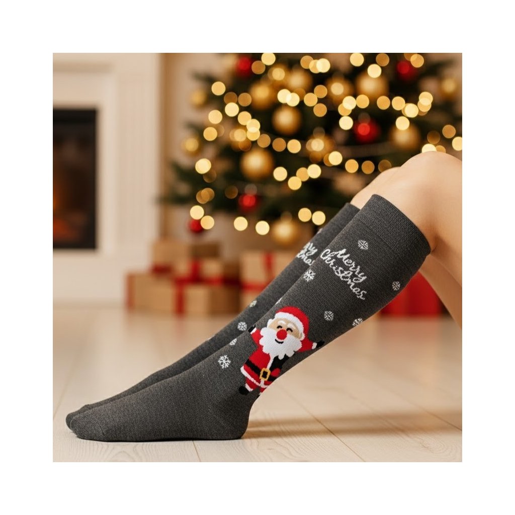 Ezek a kényelmes, szürke térdzoknik tökéletes kiegészítői az ünnepi hangulatnak. Zoknit vidám táncoló Mikulás figura és hópelyhek motívumai, valamint a "Boldog Karácsonyt" felirat díszíti a felső részen.
