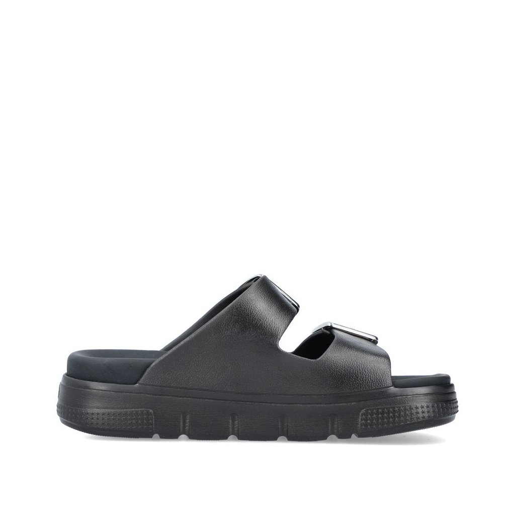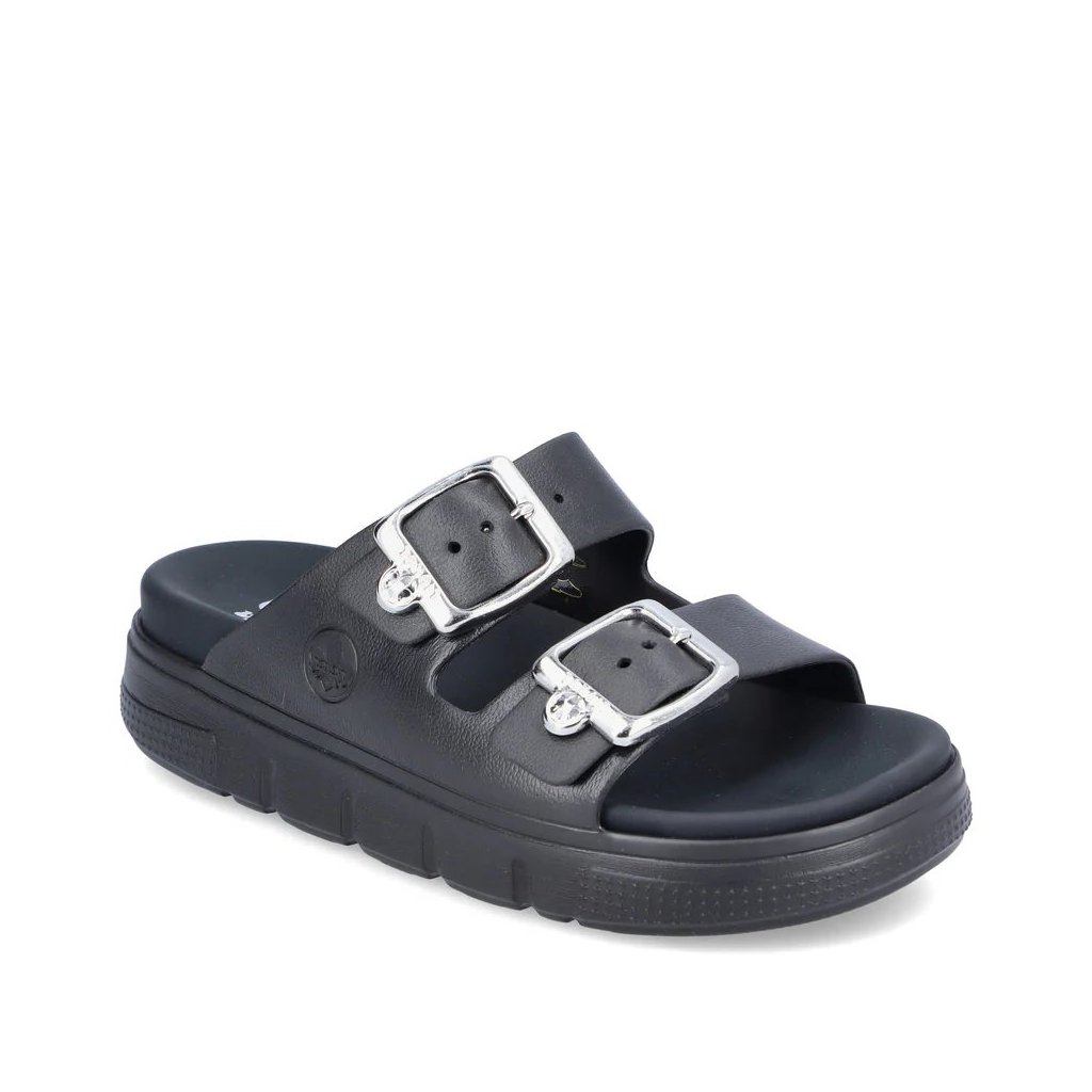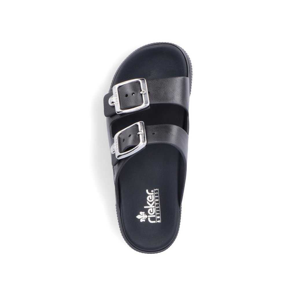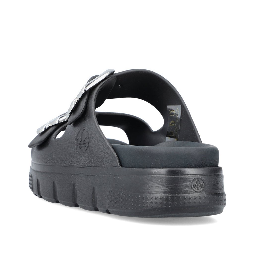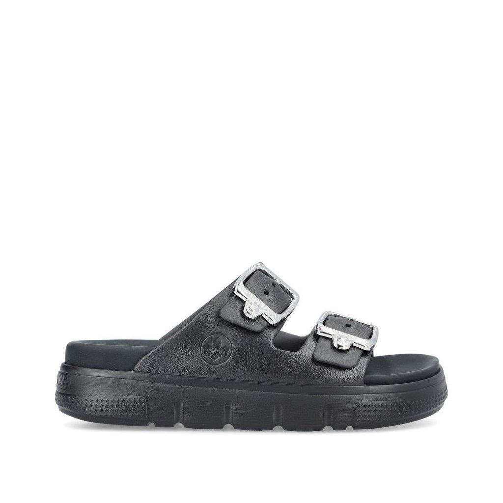 Rieker P2180-60 csúszós szandál széles pántokkal. Fekete nyári, laza papucsok pántokkal a lábujjak feletti csat beállításához. Mélyen párnázott talpbetét stílus, ideális a lábak kényeztetésére ezen a nyáron.