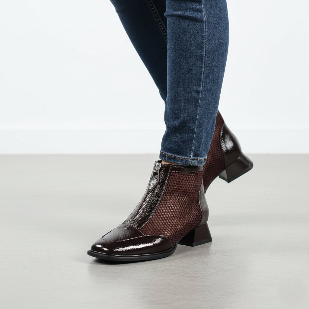 Ez a Secretshoes bokacsizma a modern elegancia és az extravagáns stílus tökéletes ötvözete. A sötétvörösbarna, lakkozott hatású részletet az oldalsó hálós betét teszi különlegessé, amely nemcsak légáteresztő képességet biztosít, hanem merész, átlátszó megjelenést is kölcsönöz a cipőnek. Az elülső cipzáras záródás megkönnyíti a felvételt, miközben kiemeli a cipő jellegzetes vonalait. A stabil, geometrikus formájú sarok egész napos kényelmet garantál, így ez a modell ideális választás azoknak a hölgyeknek, akik egyedi és magabiztos stílust keresnek minden napra.
