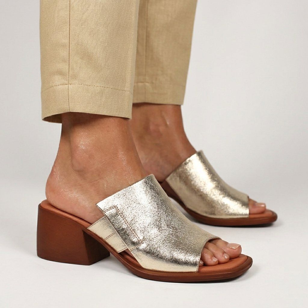 Stílusos Secretshoes márkájú, metál színű bőr papucsok ötvözik az eleganciát a kényelemmel. Az 5,5 cm magas, stabil saroknak köszönhetően ideális választás egész napos viseletre.