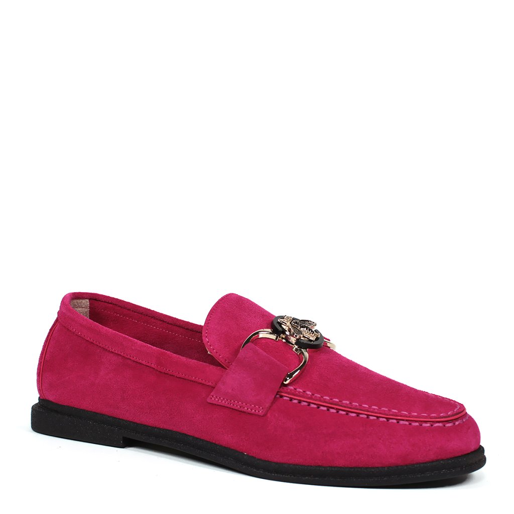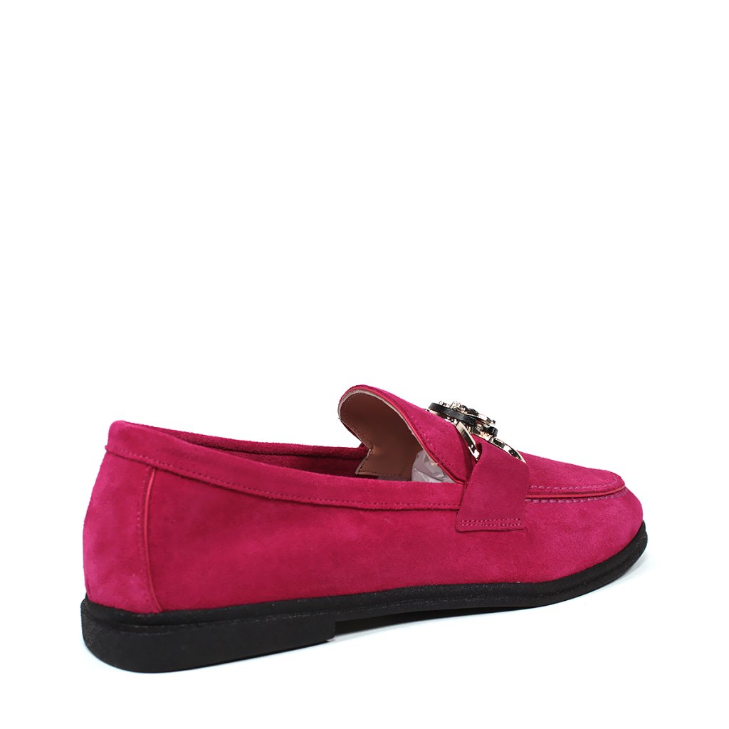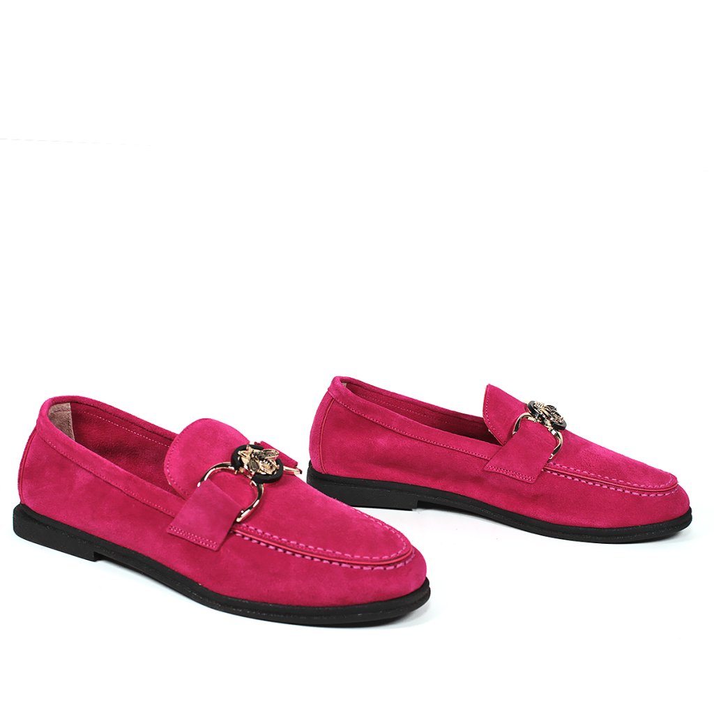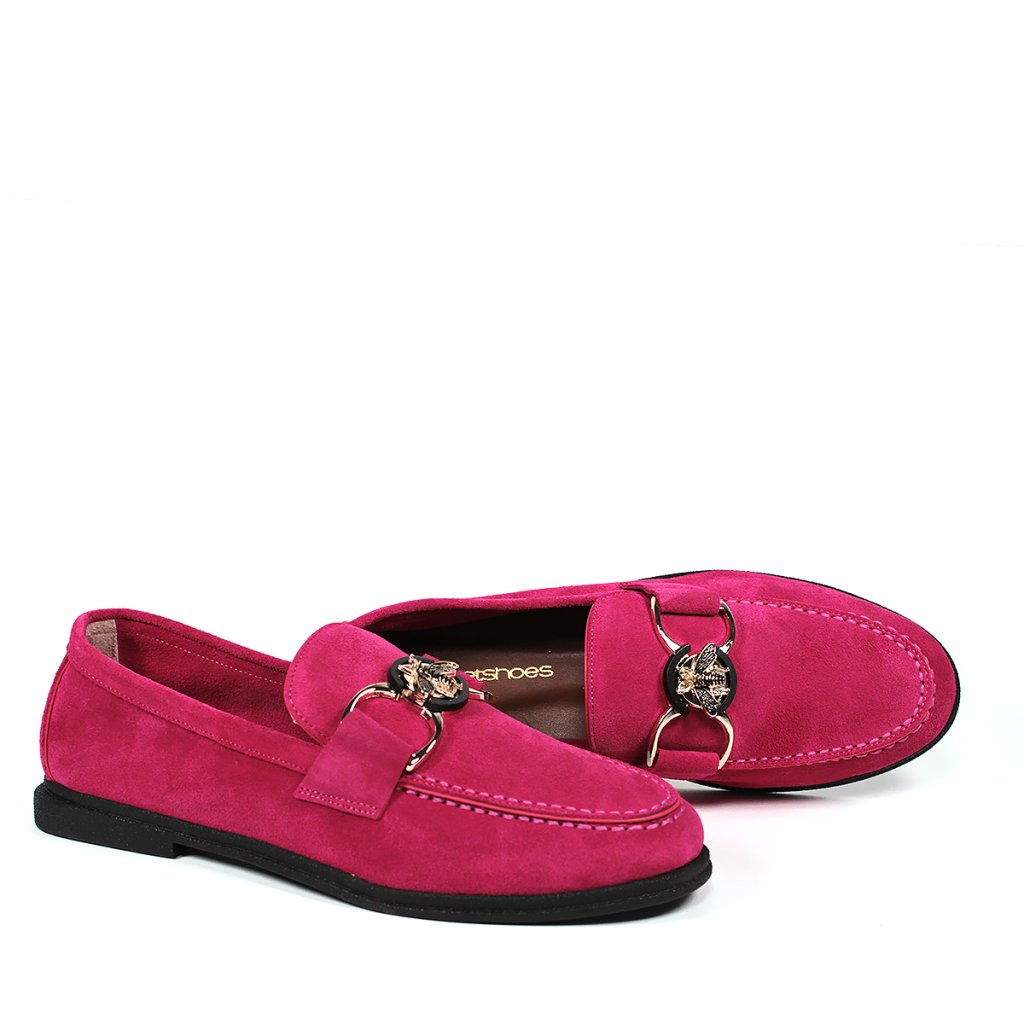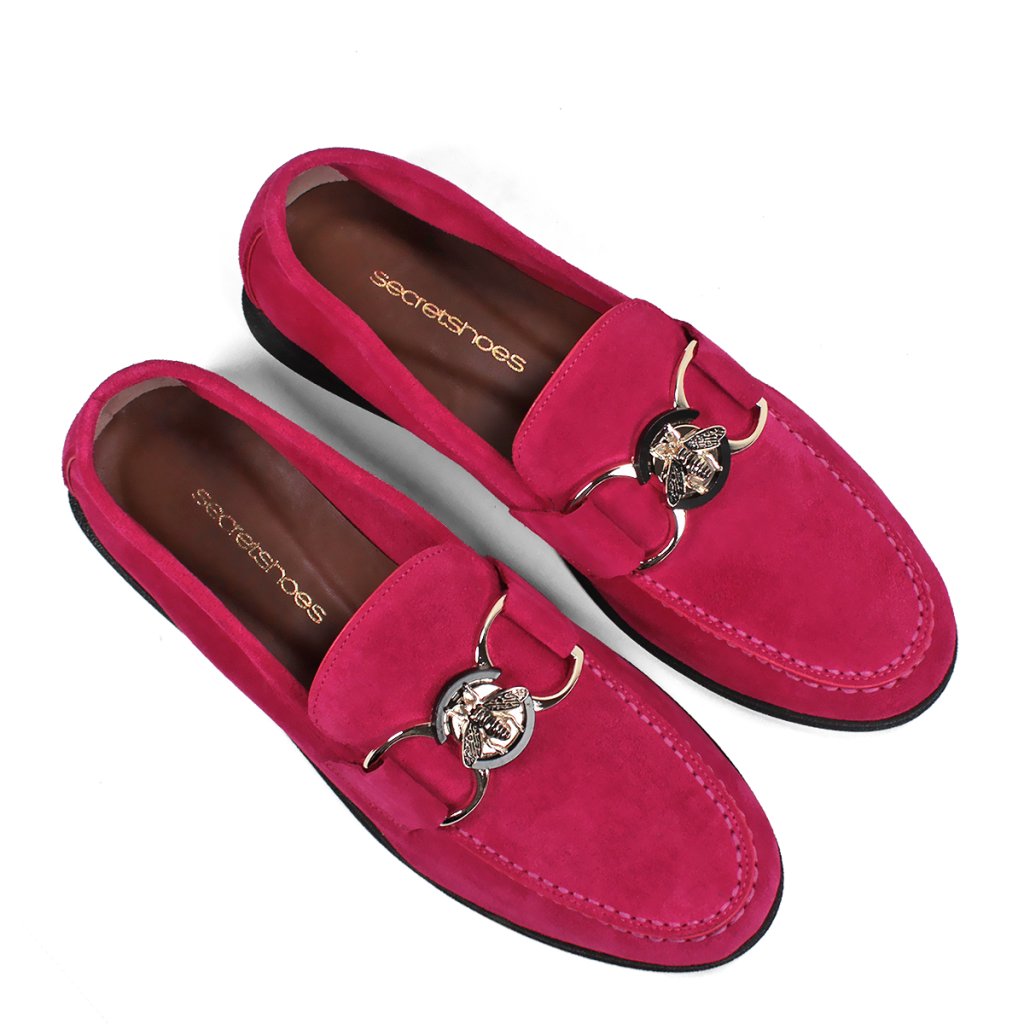 Ez a(z) Secretshoes márkájú, vibráló fukszia színű velúr mokaszin a magabiztos stílus és az egyedi megjelenés szimbóluma. A puha, prémium felületű felsőrészt egy feltűnő, arany tónusú fém dísz koronázza, amelynek középpontjában egy részletgazdagon kidolgozott, szemet gyönyörködtető méhecske motívum található. A modern fekete talp és a klasszikus varrásvonalak tökéletes kontrasztot alkotnak a merész színnel, aminek köszönhetően ez a lábbeli azonnal a legegyszerűbb ruhát is valami kivételessé és élettel telivé varázsolja.