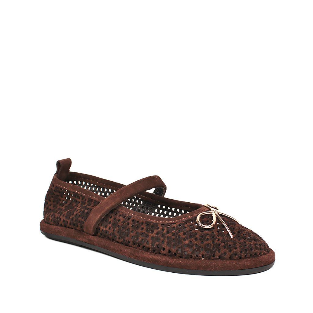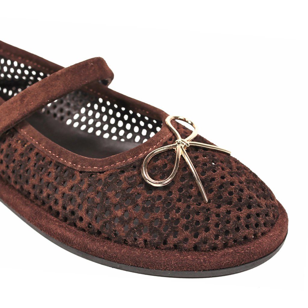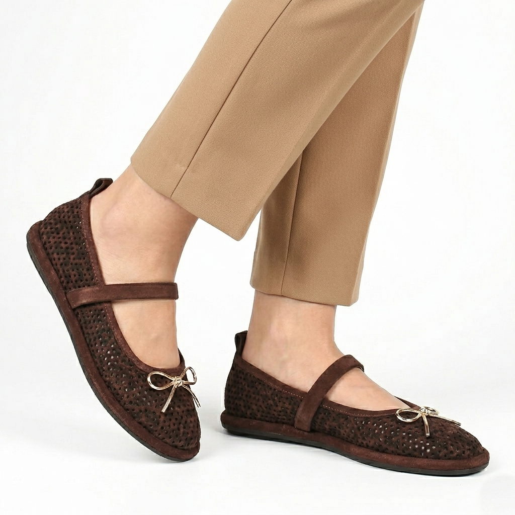 Ez a kivételes sötétbarna velúr balerina tökéletes kombinációja a nőiességnek és a kényelemnek. A teljes felületen perforált minta nemcsak egyedi textúrát kölcsönöz a cipőnek, hanem kiváló légáteresztő képességet is biztosít, így ideális választás a melegebb napokon is. A lábfej fölött átívelő pánt stabil illeszkedést biztosít, míg a finom arany masni a cipő orrán elegáns és romantikus megjelenést kölcsönöz a modellnek. A puha talp és a természetes anyagok egész napos kényelmet biztosítanak, legyen szó irodai munkáról vagy egy könnyed városi sétáról.