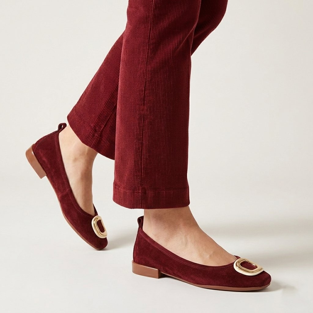 Ez az elegáns, Secretshoes márkájú balerina tökéletes ötvözete a kifinomult stílusnak és a mindennapi kényelemnek. A prémium velúrból készült, mély bordó színű felsőrész gazdag textúrát kölcsönöz a cipőnek, amelyet a lábujjon található domináns arany csat emel ki. A élénk narancssárga belső bélés modern és játékos kontrasztot alkot, míg a puha talpbetét egész napos kényelmet biztosít. Az alacsony saroknak és a letisztult vonalaknak köszönhetően ideális választás irodába vagy elegáns délutáni viselethez.