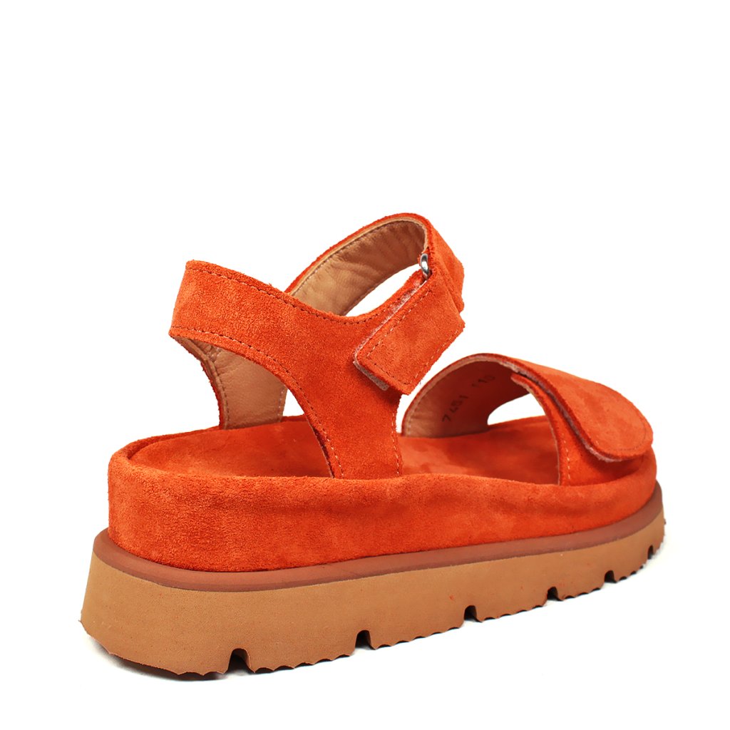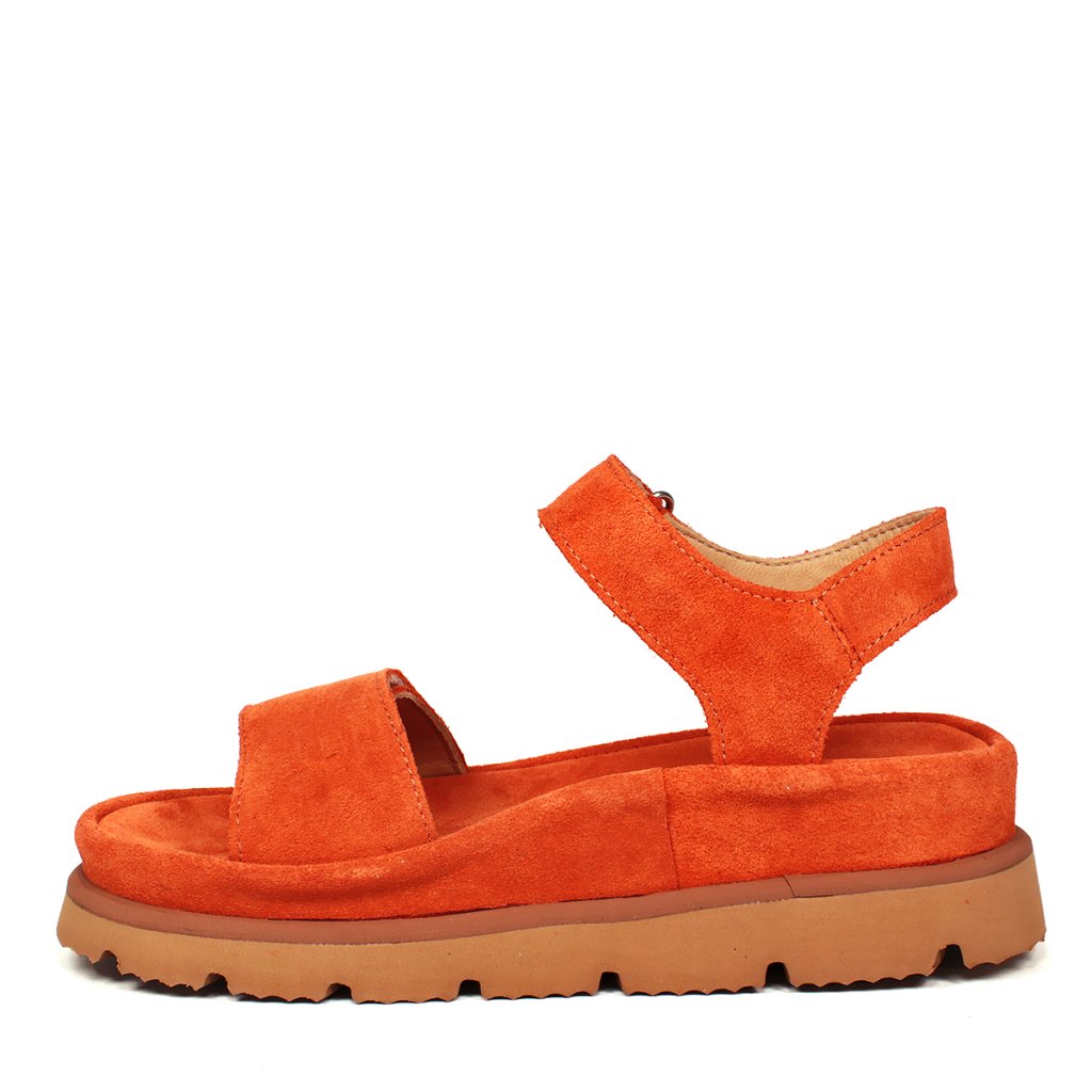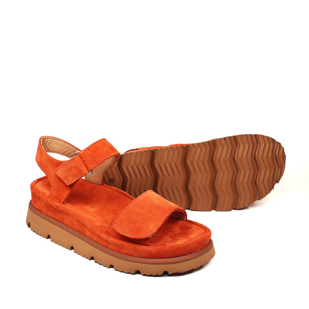 Elegáns narancssárga szandál kényelmes vastag talpú, puha velúrbőrből készült. Ideális cipő nyári sétákhoz.