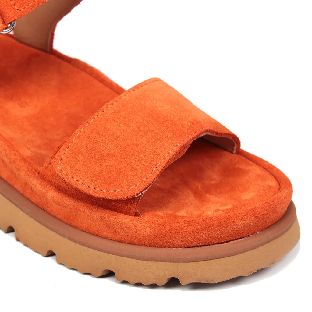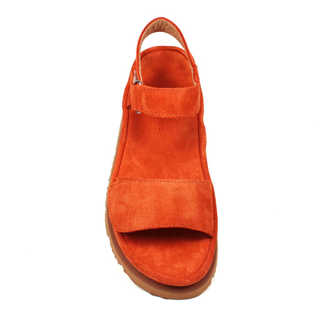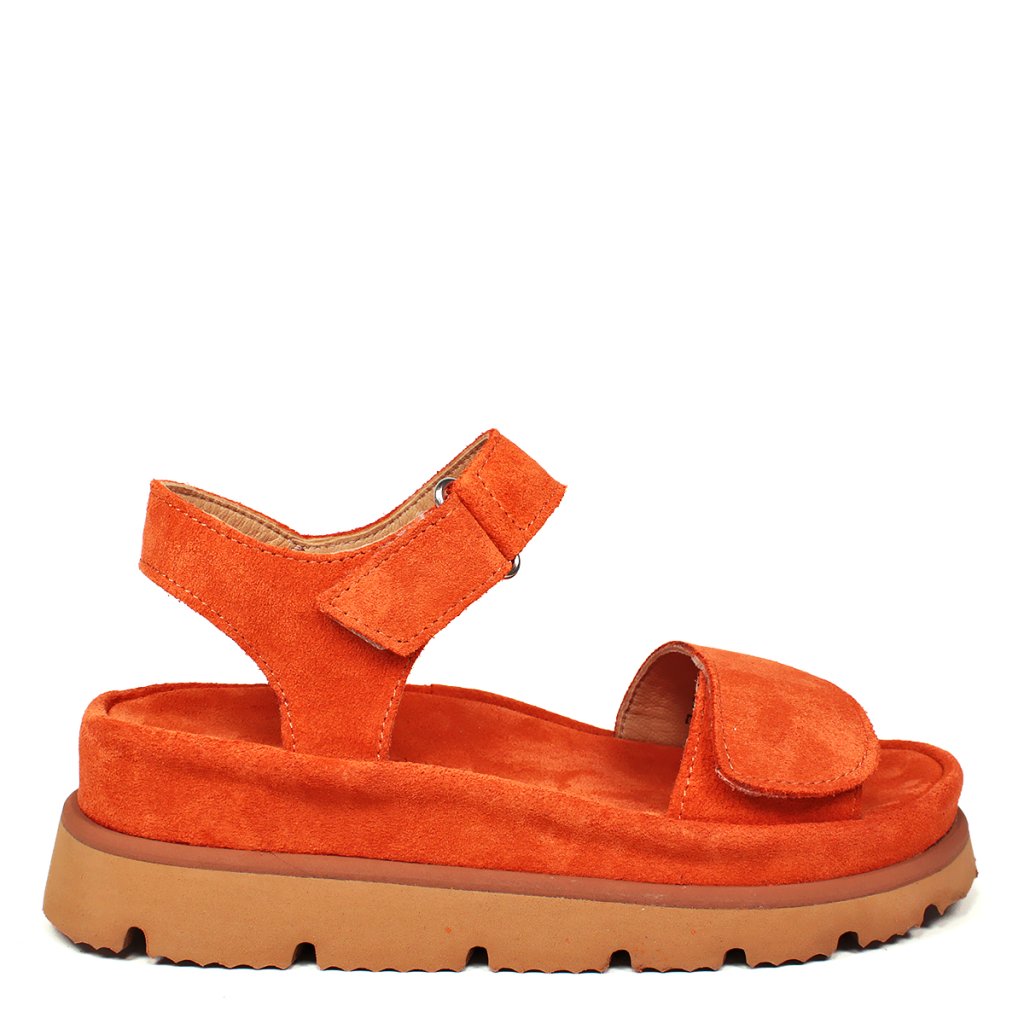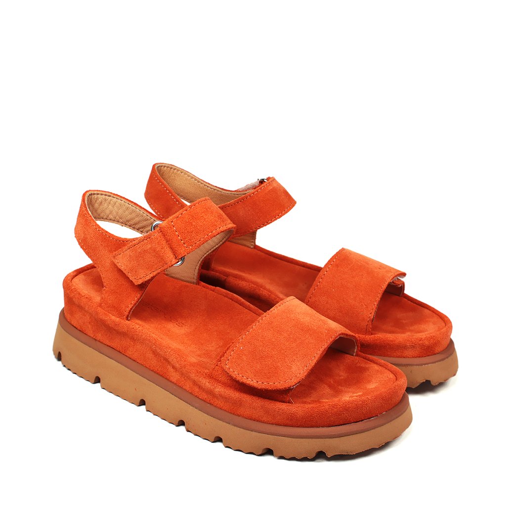 Elegáns narancssárga szandál kényelmes vastag talpú, puha velúrbőrből készült. Ideális cipő nyári sétákhoz.